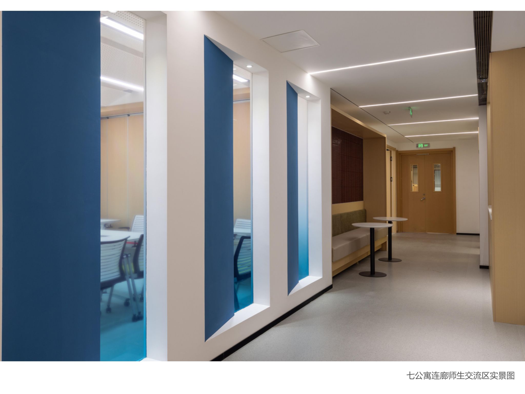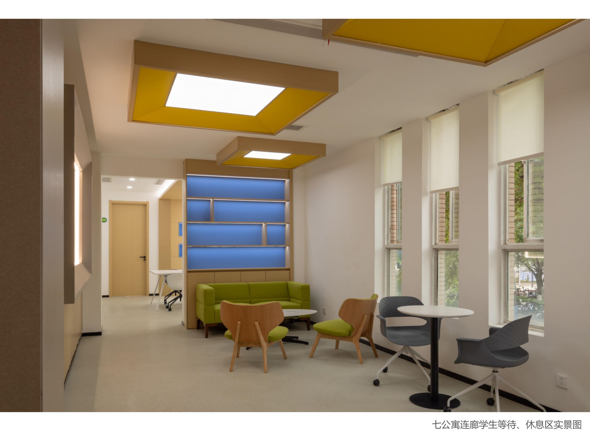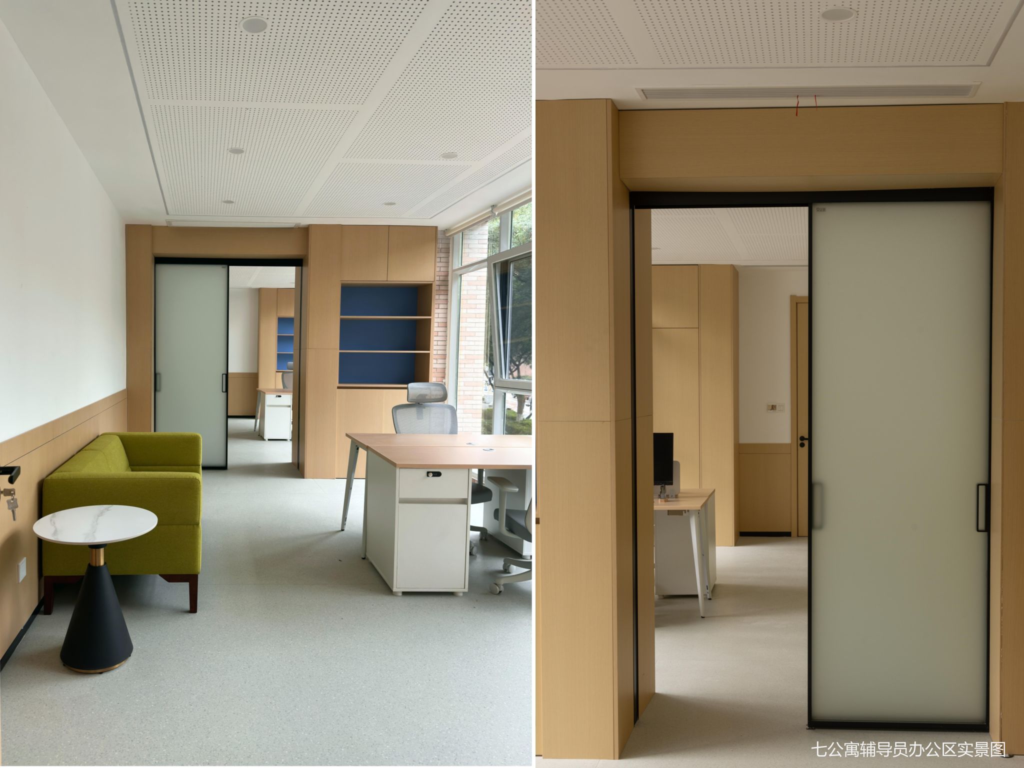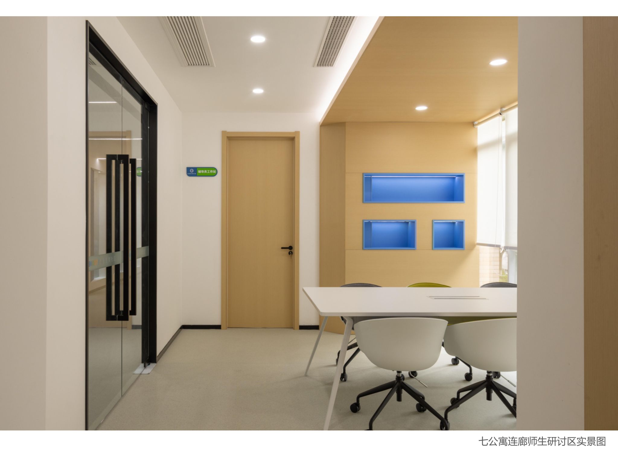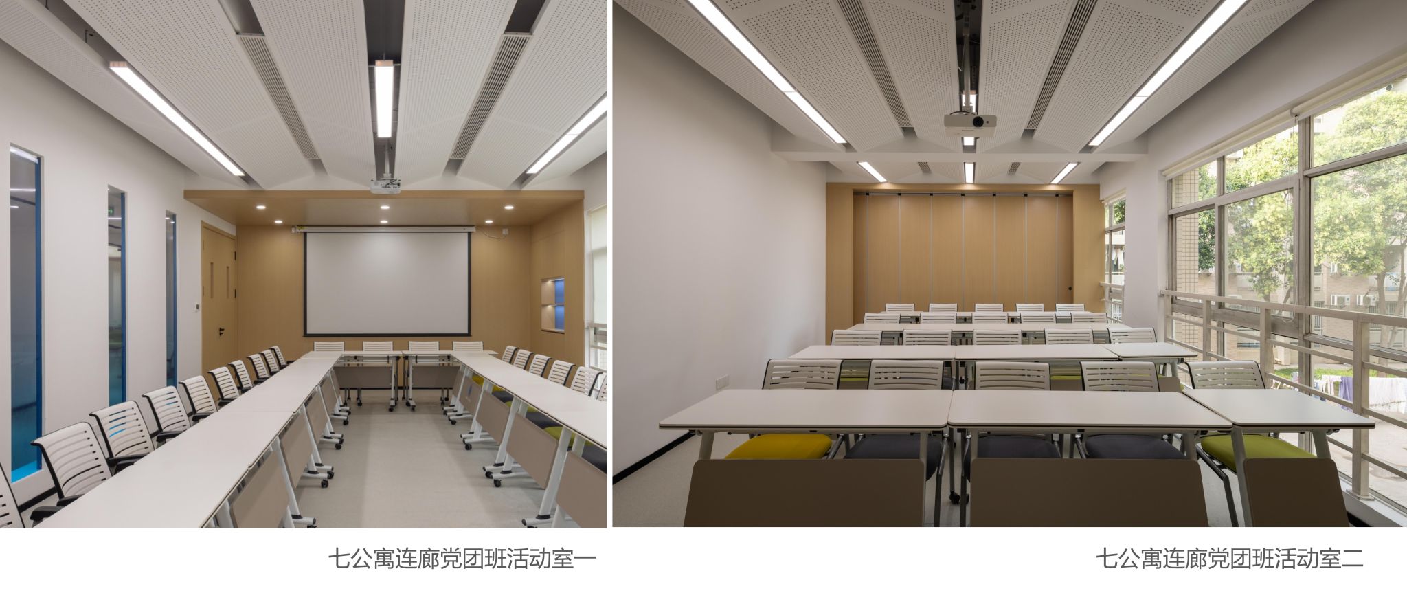 與此同時(shí),學(xué)校還將學(xué)生七公寓作為“1+N”布局的第一個(gè)試點(diǎn)建設(shè)社區(qū)服務(wù)站進(jìn)行了改造,建成了服務(wù)于輔導(dǎo)員入駐、各育人主體下沉和黨團(tuán)班集體活動(dòng)的多功能空間。公寓連廊一二層設(shè)有4間8個(gè)工位的輔導(dǎo)員辦公室,滿足該公寓學(xué)生帶班輔導(dǎo)員的入駐辦公需要;一樓大廳外設(shè)有開(kāi)放式黨團(tuán)班共享會(huì)議室,大廳內(nèi)重新改造裝修,面貌煥然一新,閱讀書(shū)柜、舒適沙發(fā)一體配備,成為學(xué)生日常休憩、互動(dòng)交流的新空間;連廊二樓專門外加鋼構(gòu)樓梯,實(shí)現(xiàn)動(dòng)線獨(dú)立分流,為各班級(jí)集中開(kāi)展活動(dòng)提供便利的專用通道,內(nèi)設(shè)有研討區(qū)、學(xué)生等待休息區(qū),建有黨團(tuán)班活動(dòng)室,多媒體互動(dòng)屏、移動(dòng)桌椅一應(yīng)俱全,折疊門可以根據(jù)使用人數(shù)靈活調(diào)整空間大小,既能承載兩個(gè)班體量的大規(guī)模集體活動(dòng),也能適應(yīng)小范圍的小組討論,實(shí)現(xiàn)了空間利用最大化,也為學(xué)校各育人力量進(jìn)公寓開(kāi)展工作提供了場(chǎng)地及設(shè)備保障;談心談話室精心建設(shè),舒適的沙發(fā)、溫暖的墻面配色,為師生咨詢談話提供了私密、安靜、舒適的空間。社區(qū)服務(wù)站的試點(diǎn)建成為我校推動(dòng)各育人力量下沉社區(qū),輔導(dǎo)員及時(shí)響應(yīng)學(xué)生訴求、就近就便開(kāi)展教育管理服務(wù)工作,推進(jìn)"服務(wù)到樓、關(guān)懷到人"理念落實(shí),實(shí)現(xiàn)"小事不出樓宇,大事不出社區(qū)"目標(biāo)提供了空間環(huán)境保障。
