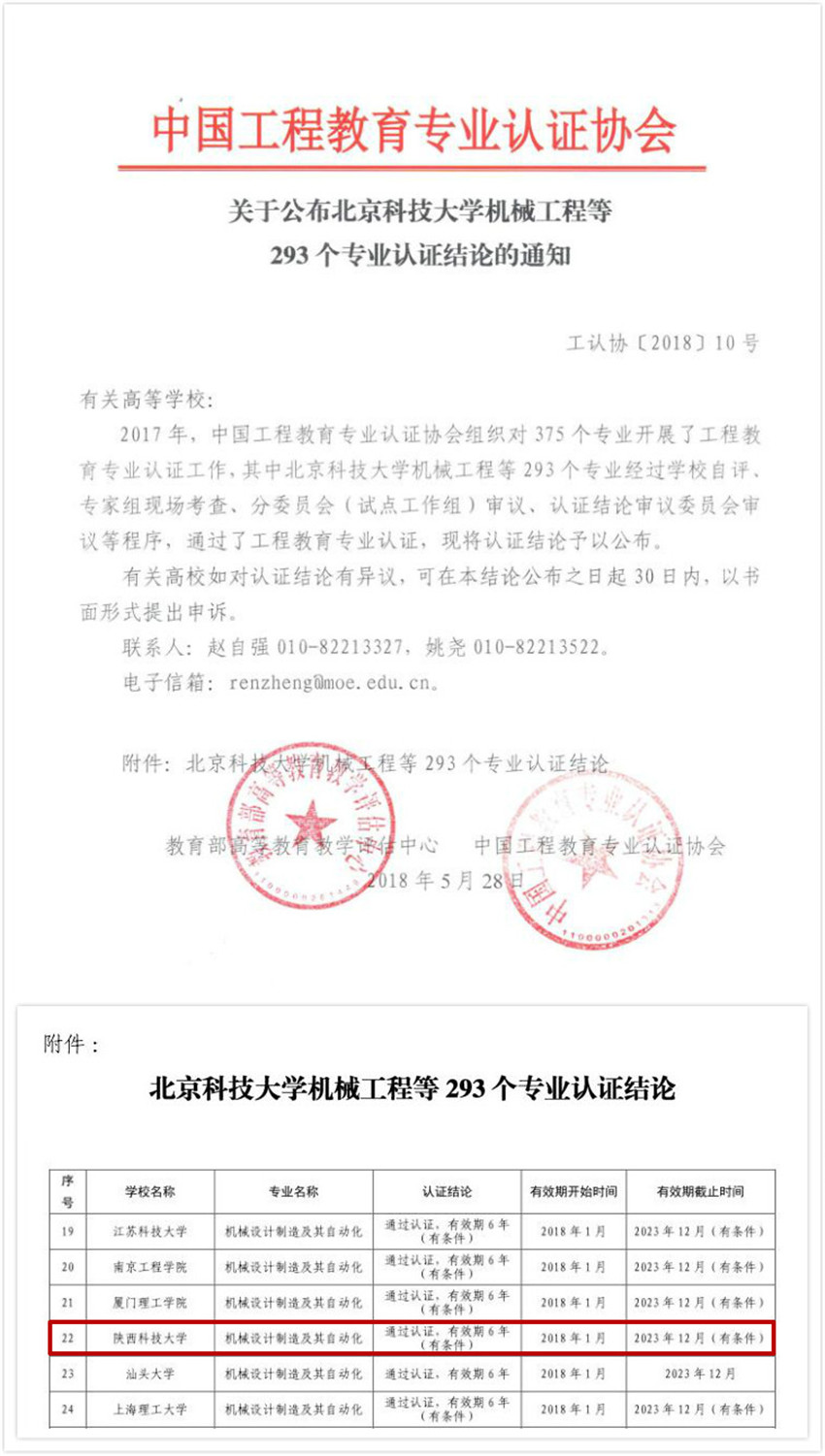 近日,教育部高等教育教學(xué)評估中心和中國工程教育專業(yè)認證協(xié)會聯(lián)合發(fā)布了《關(guān)于公布北京科技大學(xué)機械工程等293個專業(yè)認證結(jié)論的通知》(工認協(xié)〔2018〕10號),公布了2017年參加全國工程教育專業(yè)認證的認證結(jié)論,經(jīng)過學(xué)校自評、專家組現(xiàn)場考查、分委員會(試點工作組)審議、認證結(jié)論審議委員會審議等程序,全國高校共有293個專業(yè)通過認證。我校機械設(shè)計制造及其自動化專業(yè)名列其中,順利通過中國工程教育專業(yè)認證,有效期為6年(有條件),即2018年1月至2023年12月。此前,機械設(shè)計制造及其自動化專業(yè)于2017年11月6日至8日接受了工程教育專業(yè)認證專家組現(xiàn)場考查。至此,我校已有包括無機非金屬材料工程、食品科學(xué)與工程、化學(xué)工程與工藝、機械設(shè)計制造及其自動化在內(nèi)的四個專業(yè)通過工程教育專業(yè)認證。