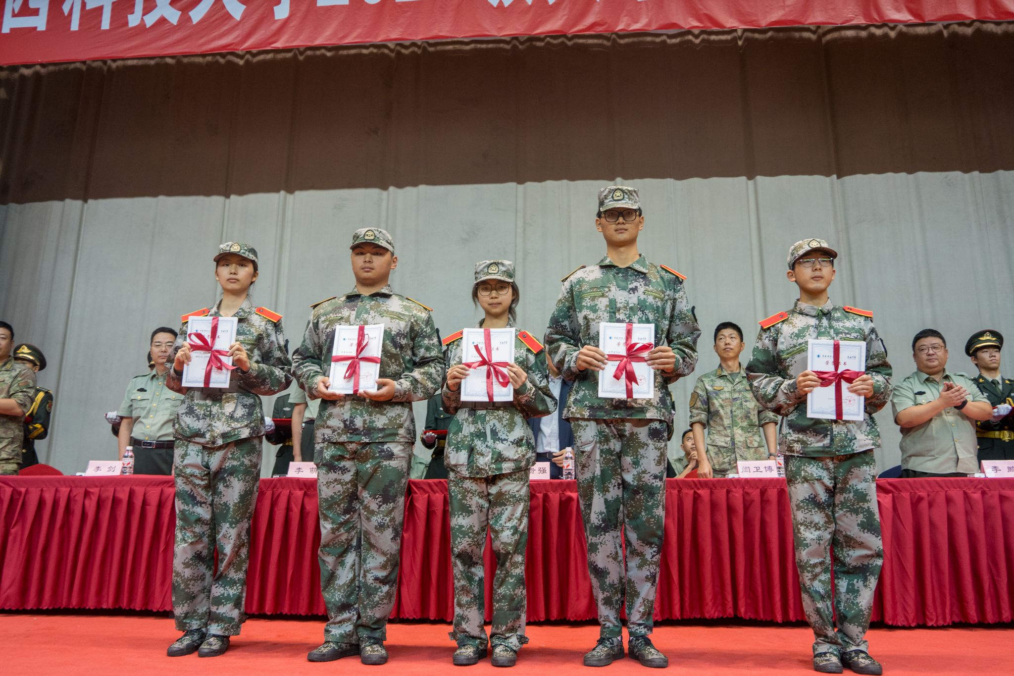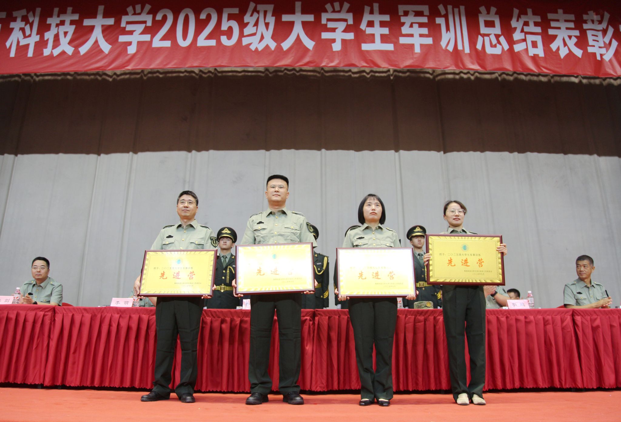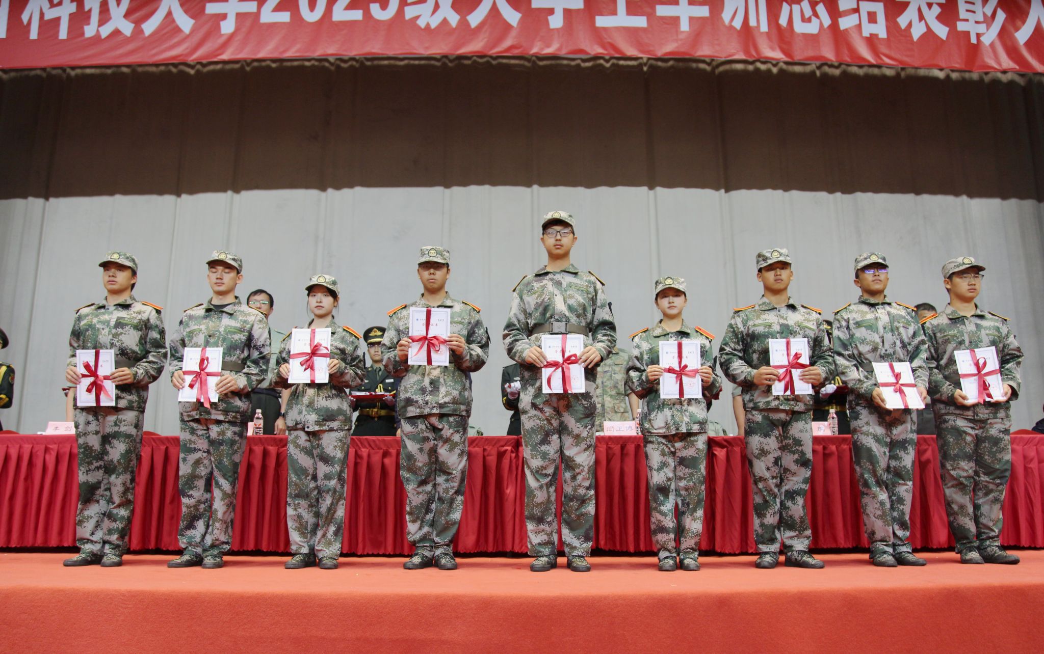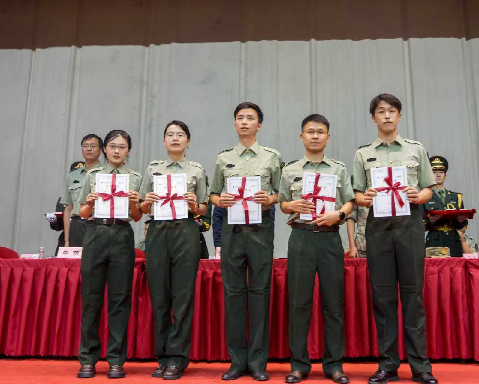 與會(huì)領(lǐng)導(dǎo)為受表彰的先進(jìn)集體和個(gè)人頒獎(jiǎng),十一營(yíng)、十四營(yíng)、九營(yíng)、一營(yíng)榮獲先進(jìn)營(yíng)稱號(hào);一營(yíng)一連等14個(gè)連隊(duì)榮獲先進(jìn)連稱號(hào);李恩等14名同志榮獲優(yōu)秀指導(dǎo)員稱號(hào);趙藝菲等238名同學(xué)榮獲優(yōu)秀學(xué)員稱號(hào)。