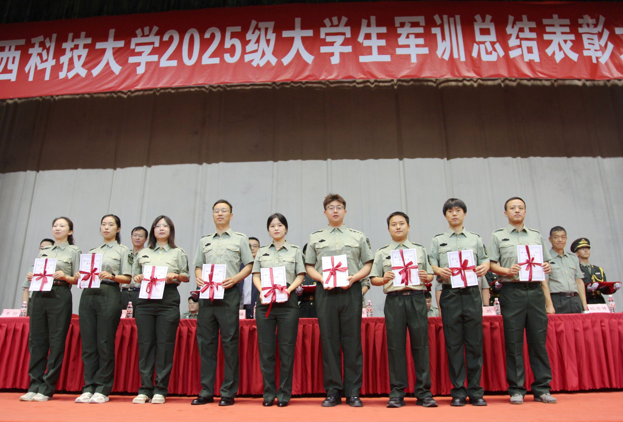 9月18日上午,我校2025級(jí)大學(xué)生軍事訓(xùn)練總結(jié)表彰大會(huì)在教學(xué)區(qū)文體館舉行。大學(xué)生軍訓(xùn)工作委員會(huì)副主任、副校長(zhǎng)費(fèi)貴強(qiáng),軍訓(xùn)旅旅長(zhǎng)、中國(guó)人民解放軍某部政治部副主任閆衛(wèi)博,軍訓(xùn)旅副旅長(zhǎng)、中國(guó)人民解放軍某部參謀姜廣毅,軍訓(xùn)旅各部門負(fù)責(zé)人,各營(yíng)教導(dǎo)員、指導(dǎo)員參加大會(huì)。大會(huì)由軍訓(xùn)旅政委、學(xué)工部(武裝部)部長(zhǎng)李曉主持。