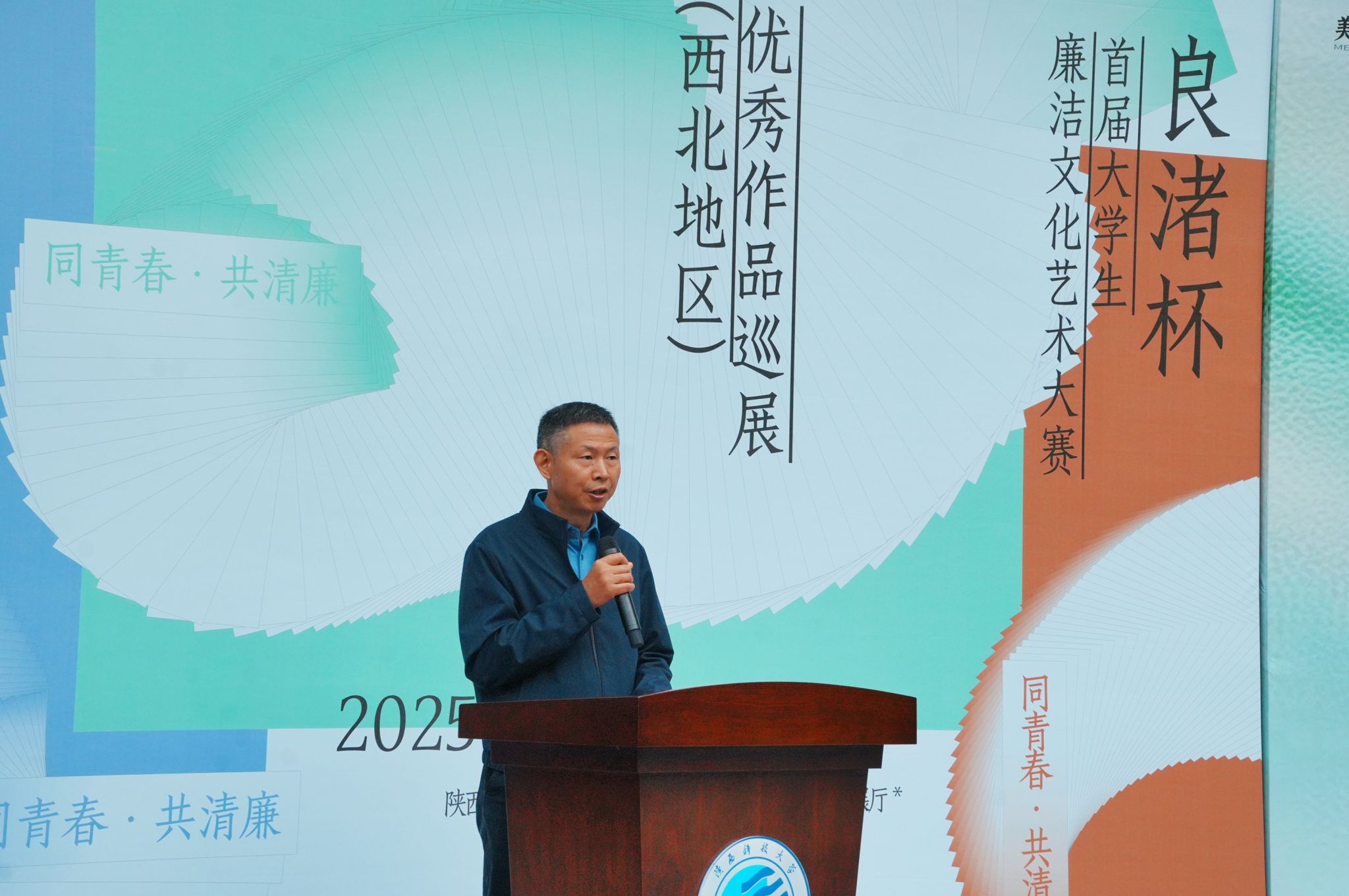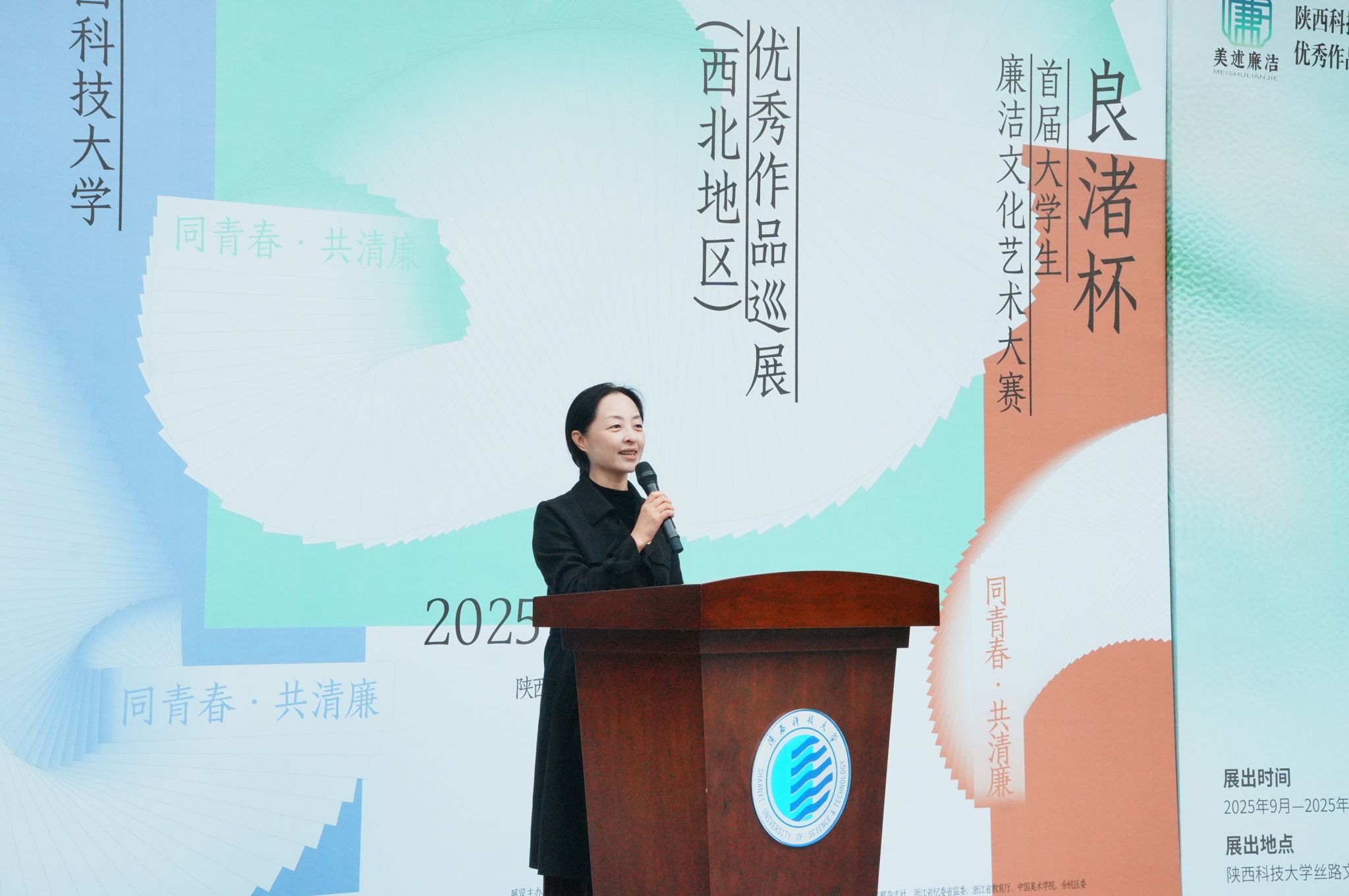 羅瑩在致辭中簡(jiǎn)要介紹了我校認(rèn)真落實(shí)省委關(guān)于清廉陜西建設(shè)的部署要求,扎實(shí)推進(jìn)“清廉科大”建設(shè)的情況,指出“良渚杯”首屆全國(guó)大學(xué)生廉潔文化藝術(shù)大賽是加強(qiáng)新時(shí)代廉潔文化建設(shè)的生動(dòng)實(shí)踐,搭建了全國(guó)大學(xué)生廉潔文化創(chuàng)作交流展示的平臺(tái),此次西北地區(qū)巡展為我校校園文化建設(shè)注入了精神給養(yǎng)和清廉之風(fēng)。對(duì)展出期間的工作作出部署,希望通過(guò)本次雙展聯(lián)辦,深化與中國(guó)美術(shù)學(xué)院在廉潔文化建設(shè)方面的合作,也期待與陜西的兄弟高校、乃至西北地區(qū)高校加強(qiáng)交流,教育引導(dǎo)高校教職工、青年學(xué)子在清廉自守中正心修身、砥礪品格,推動(dòng)黨風(fēng)政風(fēng)、教風(fēng)學(xué)風(fēng)、師德師風(fēng)持續(xù)向好,為學(xué)校事業(yè)高質(zhì)量發(fā)展?fàn)I造風(fēng)清氣正的校園環(huán)境。