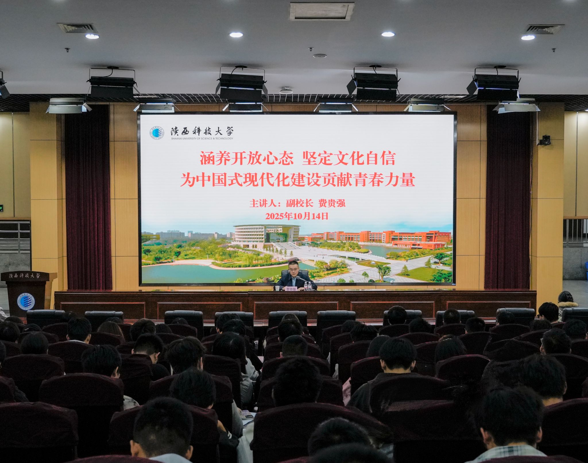 10月14日,陜西科技大學(xué)副校長費貴強以“涵養(yǎng)開放心態(tài) 堅定文化自信 為中國式現(xiàn)代化建設(shè)貢獻青春力量”為題,為2025級新生講授思政課。