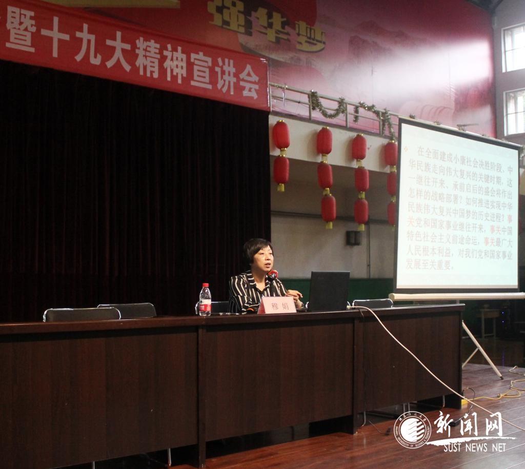 在表彰儀式后,咸陽(yáng)市黨的十九大精神專家宣講團(tuán)成員,陜西省黨校系統(tǒng)優(yōu)秀教師,中共咸陽(yáng)市委黨校黨史黨建教研室主任穆娟教授為全體黨員干部教師作了題為“面向新時(shí)代的政治宣言和行動(dòng)綱領(lǐng)——學(xué)習(xí)領(lǐng)會(huì)黨的十九大精神”的專題宣講報(bào)告。穆娟教授緊扣黨的十九大報(bào)告,從充分認(rèn)識(shí)黨的十九大的重大意義、全面準(zhǔn)確學(xué)習(xí)領(lǐng)會(huì)黨的十九大精神、以高度政治自覺(jué)貫徹落實(shí)好十九大精神三個(gè)大的方面對(duì)黨的十九大精神進(jìn)行了的解讀。