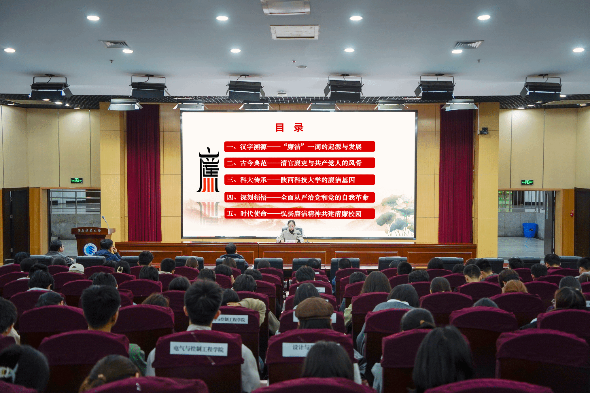 羅瑩從“‘廉潔’一詞的典籍溯源、歷史上的清官廉吏與共產(chǎn)黨人的風(fēng)骨、陜西科技大學(xué)的廉潔基因、深刻理解全面從嚴(yán)治黨和黨的自我革命、弘揚(yáng)廉潔精神共建清廉校園”五個(gè)方面展開(kāi)授課。她指出,廉潔是中華民族的傳統(tǒng)美德。在陜西科技大學(xué)校史上,以朱康、潘津生、曹光銳、游恩溥等為代表的老一輩教育工作者艱苦奮斗、無(wú)私奉獻(xiàn)、清廉自守,用畢生心血續(xù)寫(xiě)了“廉潔”二字在陜科大的時(shí)代篇章,青年學(xué)子要從他們的事跡中汲取精神滋養(yǎng),涵養(yǎng)道德修為,積極傳播廉潔理念、弘揚(yáng)廉潔文化,做廉潔精神的堅(jiān)定倡導(dǎo)者和踐行者。她指出,黨通過(guò)自我革命為青年成長(zhǎng)成才創(chuàng)造了更公平的競(jìng)爭(zhēng)環(huán)境、更清晰的價(jià)值標(biāo)桿、更可信的未來(lái)圖景,同學(xué)們要深刻理解并自覺(jué)擁護(hù)黨的路線方針政策,在創(chuàng)建廉潔社會(huì)的“大環(huán)境”下,守護(hù)校園清風(fēng)正氣。她結(jié)合校園內(nèi)可能存在的學(xué)術(shù)不端、求職造假、助學(xué)貸款失信、學(xué)生干部“微腐敗”等風(fēng)險(xiǎn)案例進(jìn)行警示教育,并向全體新生提出五點(diǎn)要求:在學(xué)術(shù)求知上堅(jiān)守“誠(chéng)信”底線,在人際交往上崇尚“簡(jiǎn)單”法則,在集體事務(wù)上恪守“公正”原則,在個(gè)人消費(fèi)上養(yǎng)成“節(jié)制”習(xí)慣,在網(wǎng)絡(luò)空間里強(qiáng)化“紅線”意識(shí)。她勉勵(lì)全體新生牢記“至誠(chéng)至博”的校訓(xùn),傳承“三創(chuàng)兩遷”的大學(xué)精神,以古今先賢和身邊的“大先生”為榜樣,樹(shù)廉潔之心、做廉潔之人、行廉潔之事,扣好人生“第一粒扣子”,用清正廉潔護(hù)航人生之路行穩(wěn)致遠(yuǎn),努力成長(zhǎng)為堪當(dāng)民族復(fù)興重任的時(shí)代新人。