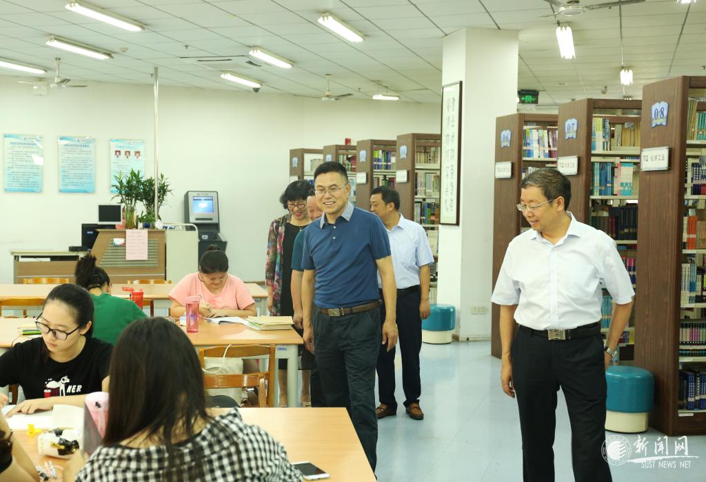 在圖書館,馬建中關(guān)心詢問圖書館暑期開放值班情況并看望了暑期依然在圖書館勤奮學(xué)習(xí)的學(xué)子;
