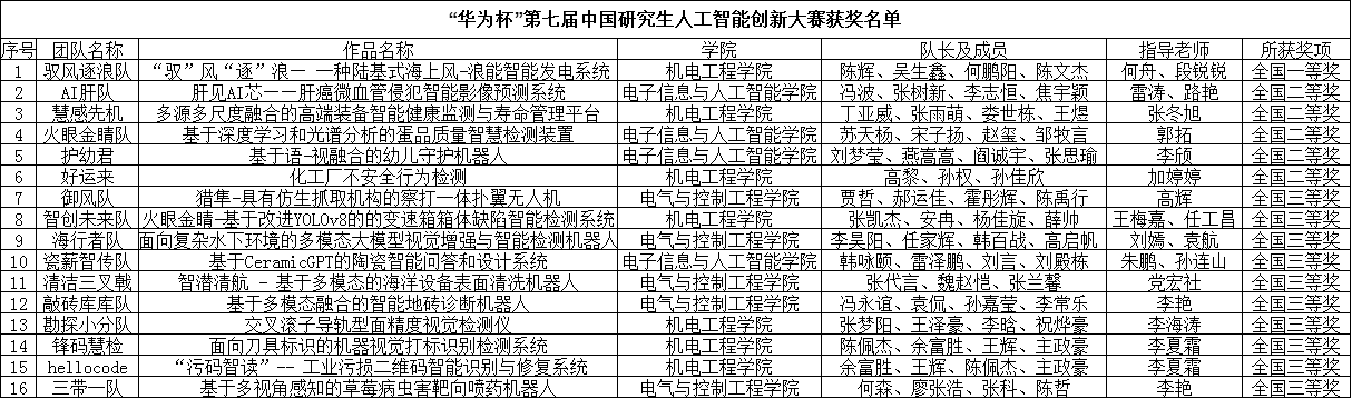 10月28日至30日,由教育部學(xué)位管理與研究生教育司指導(dǎo),中國(guó)學(xué)位與研究生教育學(xué)會(huì)、中國(guó)科協(xié)青少年科技中心主辦的“華為杯”第七屆中國(guó)研究生人工智能創(chuàng)新大賽全國(guó)總決賽在青島舉行。我校研究生團(tuán)隊(duì)斬獲16項(xiàng)國(guó)家級(jí)獎(jiǎng)項(xiàng),其中一等獎(jiǎng)1項(xiàng)、二等獎(jiǎng)5項(xiàng)、三等獎(jiǎng)10項(xiàng),獲獎(jiǎng)質(zhì)量同比提高。同時(shí),我校再次榮獲優(yōu)秀組織單位獎(jiǎng),電氣與控制工程學(xué)院何舟、段銳銳獲優(yōu)秀指導(dǎo)教師稱號(hào)。