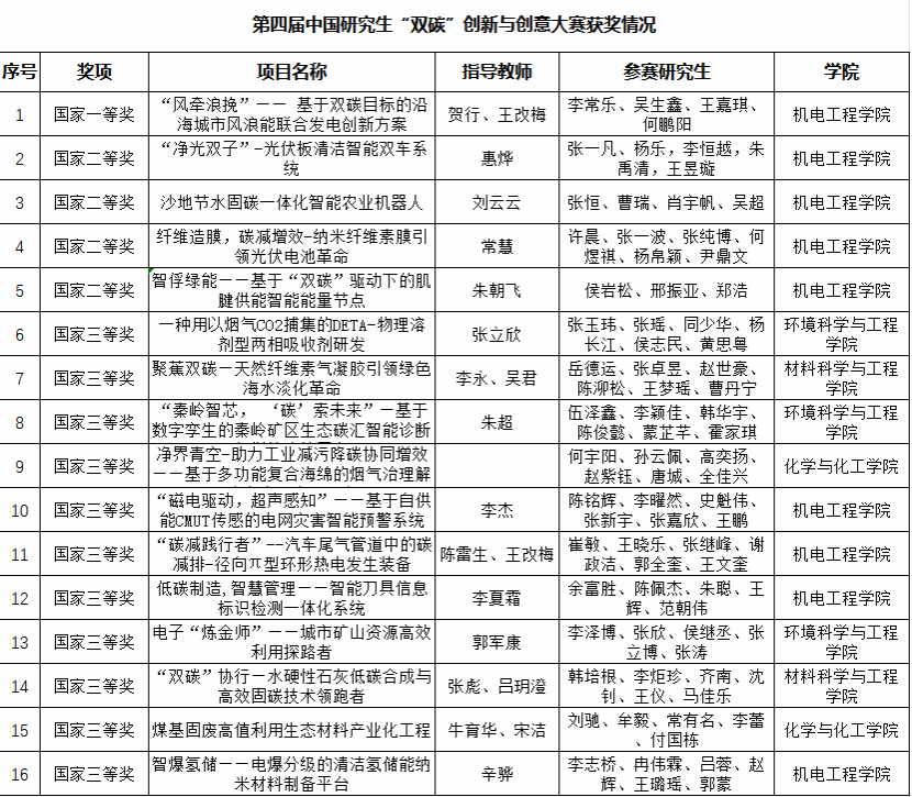 第四屆中國(guó)研究生“雙碳”創(chuàng)新與創(chuàng)意大賽決賽于11月7日至9日在沈陽化工大學(xué)落幕。賽事由教育部學(xué)位管理與研究生教育司指導(dǎo),中國(guó)學(xué)位與研究生教育學(xué)會(huì)、中國(guó)科協(xié)青少年科技中心聯(lián)合主辦。我校研究生團(tuán)隊(duì)斬獲16項(xiàng)國(guó)家級(jí)獎(jiǎng)項(xiàng),其中一等獎(jiǎng)1項(xiàng)、二等獎(jiǎng)4項(xiàng)、三等獎(jiǎng)11項(xiàng)。此次參賽,我校不僅實(shí)現(xiàn)該項(xiàng)賽事國(guó)家一等獎(jiǎng)的歷史性突破,更以總分第十的佳績(jī)獲評(píng)全國(guó)高校優(yōu)秀組織單位獎(jiǎng)。