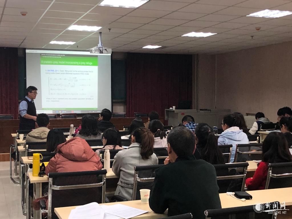 11月12日下午,應(yīng)文理學(xué)院邀請(qǐng),淮陰師范學(xué)院特聘教授王瑋明博士在理科樓文理學(xué)院學(xué)術(shù)報(bào)告廳作了題為“Bifurcation and spatiotemporal pattern formation in a predator-prey model”的學(xué)術(shù)報(bào)告。報(bào)告會(huì)由文理學(xué)院院長(zhǎng)藺小林教授主持,學(xué)院研究生和部分青年教師參加了報(bào)告會(huì)。