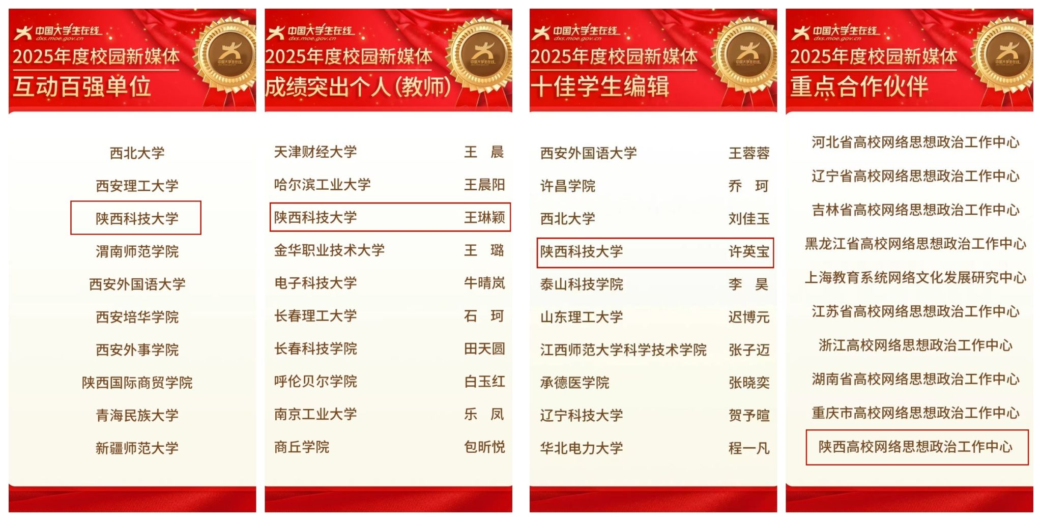 近日,教育部“中國(guó)大學(xué)生在線”2025年度校園新媒體表彰名單公布,陜西科技大學(xué)榮獲多個(gè)獎(jiǎng)項(xiàng)。其中,我校獲評(píng)“互動(dòng)百?gòu)?qiáng)單位”,輕工科學(xué)與工程學(xué)院王琳穎榮獲“成績(jī)突出個(gè)人(教師)”,設(shè)計(jì)與藝術(shù)學(xué)院播音與主持專業(yè)241班許英寶榮獲“十佳學(xué)生編輯”,陜西高校網(wǎng)絡(luò)思想政治工作中心榮獲“重點(diǎn)合作伙伴”。