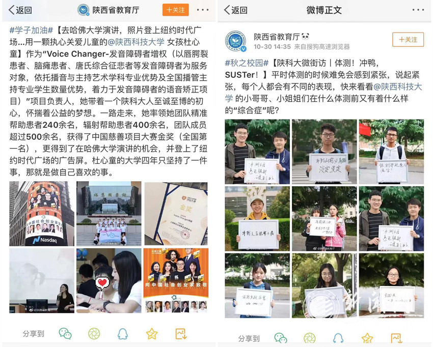 截至目前,陜西科技大學(xué)新媒體所發(fā)布話題不僅在校內(nèi)師生中廣為流傳,也被陜西省教育廳、陜西身邊事、陜西都市快報、陜西微生活、華商網(wǎng)、人民網(wǎng)陜西頻道等多家媒體平臺進(jìn)行了轉(zhuǎn)發(fā)和報道。
