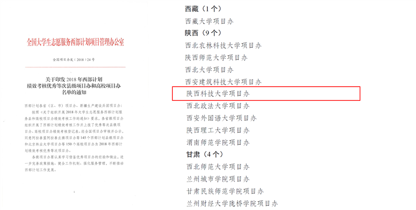 近日,全國大學生志愿服務西部計劃項目辦下發(fā)《關于印發(fā)2018年西部計劃績效考核優(yōu)秀等次縣級項目辦和高校項目辦名單的通知》,我校榮獲2018年全國大學生志愿服務西部計劃績效考核“優(yōu)秀項目辦”稱號。