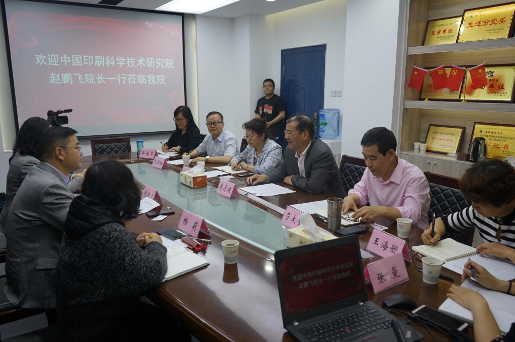 李志健對(duì)趙鵬飛一行來我校交流表示熱烈歡迎,他介紹了我?!叭齽?chuàng)兩遷”發(fā)展歷史、“三步走”發(fā)展戰(zhàn)略及近年來“人才工程”等情況。趙鵬飛介紹了中印院的基本情況、重點(diǎn)研發(fā)方向、重點(diǎn)項(xiàng)目。弓太生從學(xué)科專業(yè)建設(shè)、科學(xué)研究、人才培養(yǎng)等方面介紹了輕工學(xué)院的基本情況。印刷工程系主任劉國棟介紹了印刷工程系的基本情況。