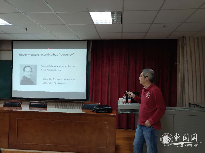 姜海峰教授首先從經(jīng)典物理學(xué)牛頓時(shí)間概念出發(fā),以時(shí)間頻率技術(shù)的基礎(chǔ)性、廣泛性和前沿性基礎(chǔ),通過(guò)對(duì)飛秒光頻梳研究領(lǐng)域諾貝爾物理學(xué)獎(jiǎng)的梳理,對(duì)飛秒光頻梳技術(shù)的特點(diǎn)、分類(lèi)以及研究現(xiàn)狀等進(jìn)行了詳細(xì)報(bào)告。他還以課題組近十年在飛秒激光光頻梳領(lǐng)域的取得的研究成果為主線,進(jìn)一步報(bào)告了飛秒光頻梳的發(fā)展趨勢(shì)及其他們課題組在該領(lǐng)域的研究貢獻(xiàn)。姜海峰研究員的報(bào)告既有物理基礎(chǔ),又有理論背景和學(xué)科前沿成果報(bào)告,使在座聽(tīng)眾對(duì)飛秒光頻梳技術(shù)的重要性有了新認(rèn)識(shí),并產(chǎn)生了濃厚的興趣。