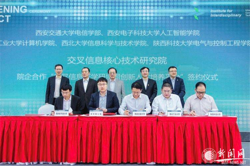 投運(yùn)慶典儀式上,在姚期智、鐘洪江、王勇、楊斌、李志軍的共同見證下,交叉核心院與陜西科技大學(xué)電氣與控制工程學(xué)院、西安交通大學(xué)電信學(xué)部、西安電子科技大學(xué)人工智能學(xué)院、西北工業(yè)大學(xué)計算機(jī)學(xué)院、西北大學(xué)信息科學(xué)與技術(shù)學(xué)院等5所培養(yǎng)單位以及中國銀行業(yè)協(xié)會、德邦證券股份有限公司、西安深信科創(chuàng)信息技術(shù)有限公司、新石器交叉信息核心技術(shù)研究院(西安)等4家企業(yè)簽約,合作建立“交叉信息產(chǎn)學(xué)研協(xié)同創(chuàng)新人才培養(yǎng)平臺”。湯偉代表我校電控學(xué)院上臺簽約并領(lǐng)牌。