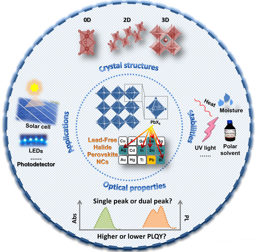 2014年,鹵化物鈣鈦礦納米晶的首次發(fā)現(xiàn)吸引了全球的目光。然而,傳統(tǒng)鹵化物鈣鈦礦納米晶往往含有毒性元素鉛,從而限制其進一步商業(yè)化應(yīng)用。在這種形勢下,既能避免毒性金屬元素使用,又能保留鈣鈦礦優(yōu)異特性的無鉛鹵化物鈣鈦礦納米晶應(yīng)運而生。然而,圍繞無鉛鹵化物鈣鈦礦納米晶的相關(guān)研究報道數(shù)據(jù)缺乏系統(tǒng)性和深入性,導(dǎo)致現(xiàn)階段該類材料研究進展較緩?;诖?,馬建中教授團隊對現(xiàn)階段無鉛鹵化物鈣鈦礦納米晶的系列報道進行了系統(tǒng)而深入的研讀,并結(jié)合團隊相關(guān)研究基礎(chǔ),在該論文中就無鉛鹵化物鈣鈦礦納米晶的晶體結(jié)構(gòu)、穩(wěn)定性、光學(xué)性能、制備方法及最新應(yīng)用等進行了全面介紹;針對“飽受爭議”的穩(wěn)定性及光學(xué)性能問題,首次系統(tǒng)分析了無鉛鹵化物鈣鈦礦納米晶穩(wěn)定性及光學(xué)性能的影響機制,并就如何提高其穩(wěn)定性及光學(xué)性能進行了深入探討。該論文的發(fā)表有望對該類材料的后續(xù)深入研究和開發(fā)提供較強的理論指導(dǎo)和借鑒意義。