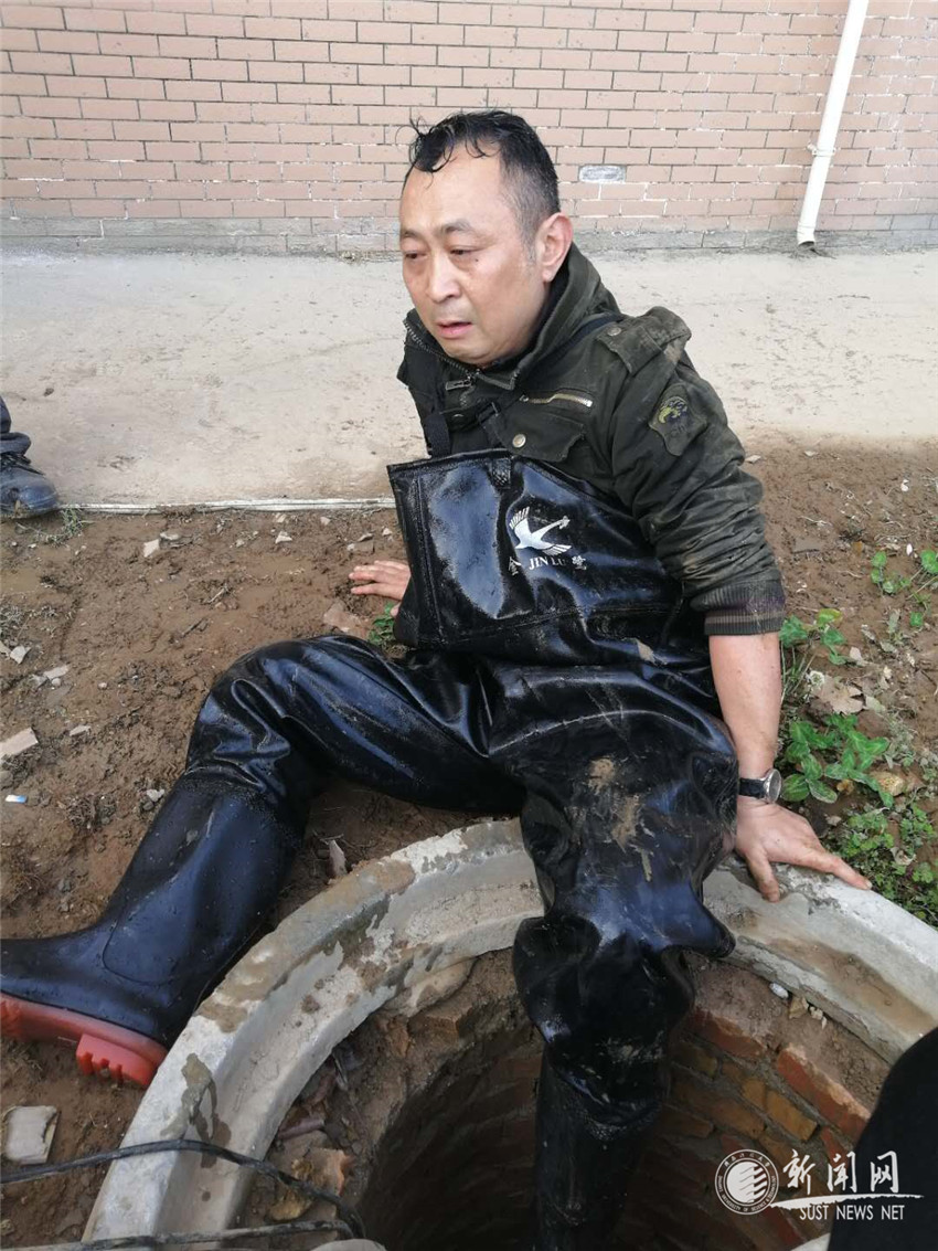 葛磊(中)下到狹小的污水井里進行管道疏通