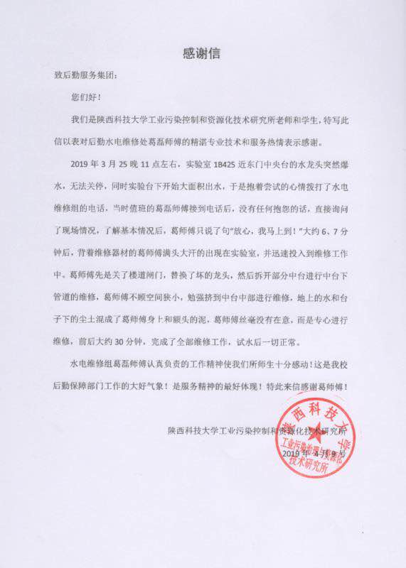 4月9日,學(xué)校工業(yè)污染控制和資源化技術(shù)研究所老師和學(xué)生聯(lián)名給后勤集團寫去感謝信,感謝后勤水電維修班葛磊師傅搶修及時,修理高效,表示衷心感謝,感謝后勤集團為牢記使命服務(wù)師生至上的宗旨。