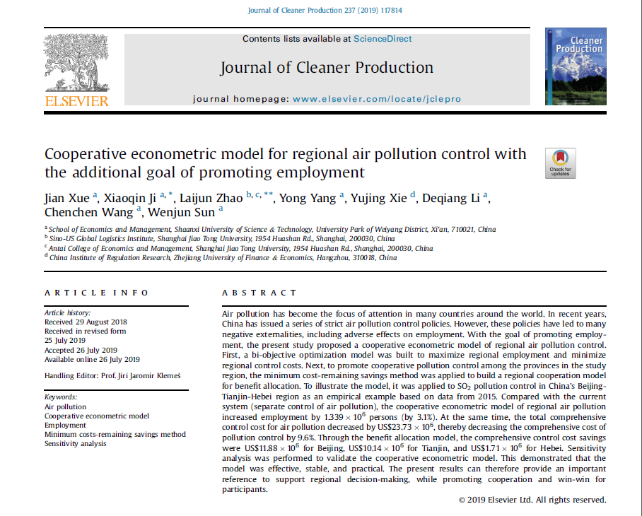 論文以陜西科技大學(xué)經(jīng)濟(jì)與管理學(xué)院為第一完成單位,薛儉教授為第一作者,2017級(jí)碩士研究生吉小琴和上海交通大學(xué)趙來(lái)軍教授為共同通訊作者。該研究以近年來(lái)國(guó)家出臺(tái)系列嚴(yán)厲大氣污染治理政策為背景,提出了同時(shí)考慮社會(huì)就業(yè)和大氣污染治理成本的合作計(jì)量經(jīng)濟(jì)模型,以緩解大氣污染治理對(duì)社會(huì)就業(yè)所產(chǎn)生的負(fù)外部性,并運(yùn)用Minimum Cost-Remaining Savings方法對(duì)區(qū)域大氣污染合作治理收益進(jìn)行分配。研究結(jié)果表明:論文提出的合作計(jì)量經(jīng)濟(jì)模型在社會(huì)就業(yè)和環(huán)境治理成本方面明顯優(yōu)于現(xiàn)行的屬地治理模式,對(duì)實(shí)現(xiàn)經(jīng)濟(jì)、社會(huì)和環(huán)境可持續(xù)發(fā)展具有重要的理論參考價(jià)值。