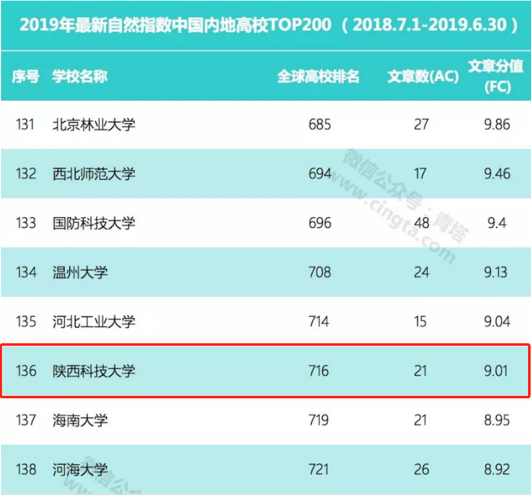近期,自然指數(shù)網(wǎng)站更新了2019年最新的自然指數(shù)排名(統(tǒng)計時間節(jié)點為2018.7.1—2019.6.30),我校位列內(nèi)地高校第136名,居陜西高校第7,省屬高校第2,原輕工院校第2。較今年6月份公布的2019自然指數(shù)年度排行榜(統(tǒng)計時間節(jié)點為2018.1.1—2018.12.31)上升了63名。本期文章數(shù)21篇,文章分值9.01,入選論文數(shù)量比去年年底增加12篇,增長133%。繼續(xù)表現(xiàn)出我校在自然科學(xué)研究領(lǐng)域的特色和優(yōu)勢。