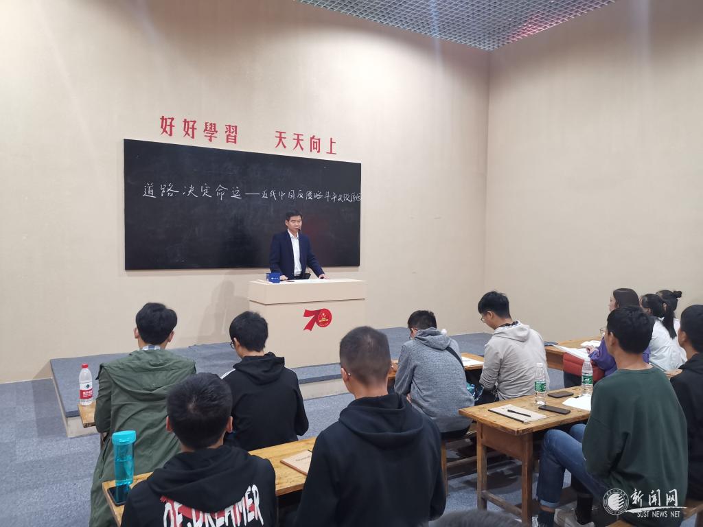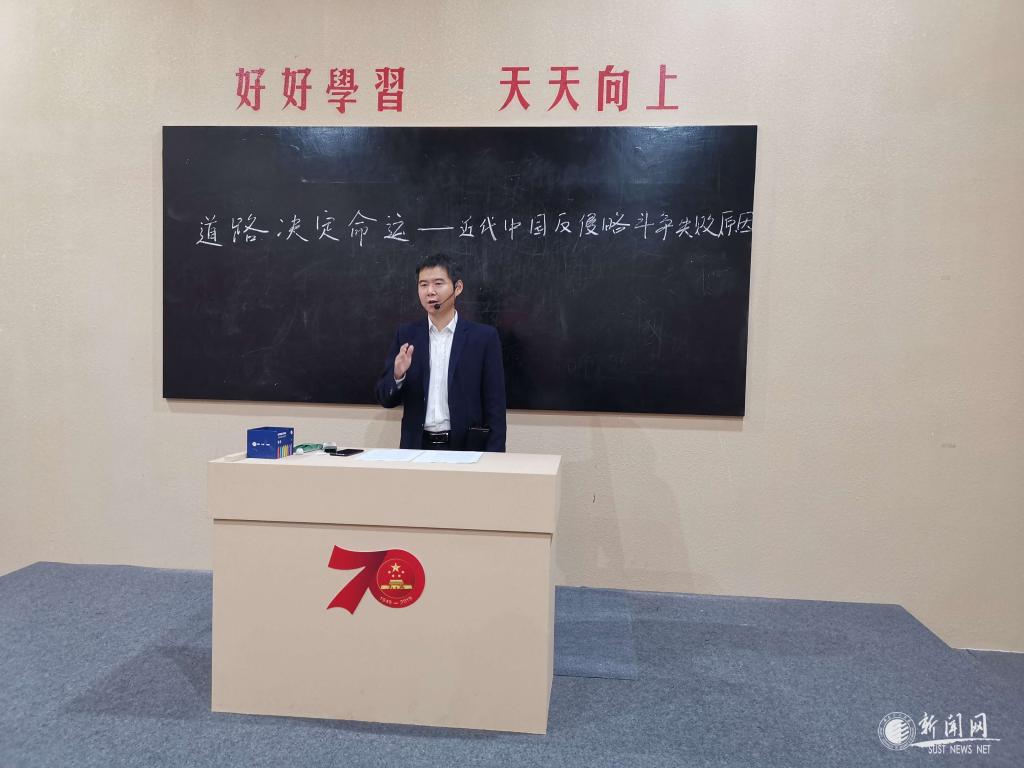 大粉筆、油漆的黑板、普通的小木桌、長(zhǎng)條凳,10月10日下午,在陜西省慶祝中華人民共和國(guó)成立70周年成就展上,來(lái)自我校馬克思主義學(xué)院的武端利副教授為40名大學(xué)生和部分參觀群眾上了一堂以《道路決定命運(yùn)——近代中國(guó)反侵略斗爭(zhēng)失敗的原因》的現(xiàn)場(chǎng)思政課。