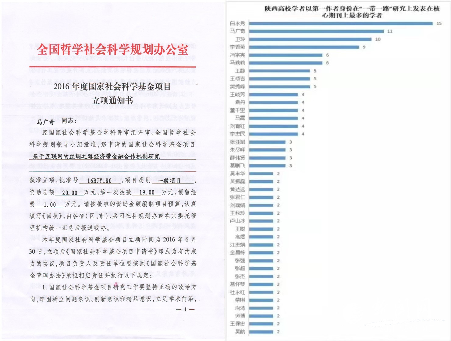 近年來(lái),馬廣奇教授團(tuán)隊(duì)圍繞國(guó)家社科基金“基于互聯(lián)網(wǎng)的絲綢之路經(jīng)濟(jì)帶金融合作機(jī)制研究”,陜西省社會(huì)科學(xué)基金重點(diǎn)項(xiàng)目“絲綢之路經(jīng)濟(jì)帶貨幣流通問(wèn)題研究”,以及西安市社會(huì)科學(xué)規(guī)劃基金重點(diǎn)項(xiàng)目“絲綢之路經(jīng)濟(jì)帶西安金融定位與發(fā)展研究”,對(duì)“一帶一路”建設(shè)進(jìn)行了系統(tǒng)研究,在國(guó)內(nèi)率先提出了“絲路貨幣”、“絲路金融”的概念,發(fā)表相關(guān)論文30余篇。2018年9月,馬廣奇教授被聘為陜西省第十三屆人大常委會(huì)財(cái)經(jīng)咨詢(xún)專(zhuān)家。他還先后入選“中國(guó)哲學(xué)社會(huì)科學(xué)‘經(jīng)濟(jì)學(xué)’最有影響力學(xué)者排行榜”“2018年全國(guó)高校人文社會(huì)科學(xué)期刊論文寫(xiě)作勤奮榜”“陜西高校學(xué)者‘一帶一路’研究論文排行榜”等,產(chǎn)生了較大社會(huì)影響。