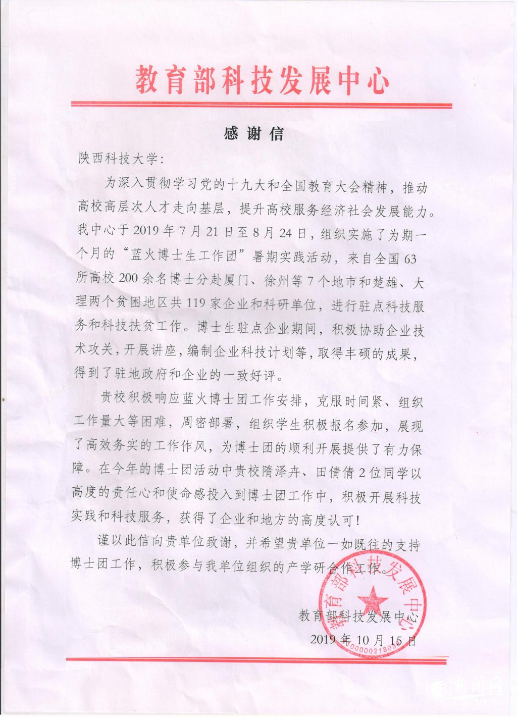 近日我校收到教育部科技發(fā)展中心發(fā)來(lái)的感謝信,對(duì)我校大力支持教育部組織開展的2019年“藍(lán)火博士生工作團(tuán)”暑期實(shí)踐活動(dòng)予以致謝,并對(duì)我校隋澤卉、田倩倩2位研究生的辛勤付出提出表?yè)P(yáng)。這是教育部對(duì)我校研究生教育工作的認(rèn)可,同時(shí)也為我校研究生繼續(xù)參與國(guó)家級(jí)產(chǎn)學(xué)研合作項(xiàng)目奠定了良好的基礎(chǔ)。
