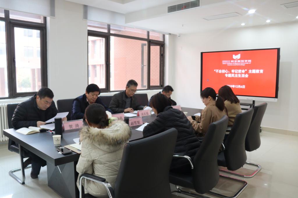12月6日下午,我校阿爾斯特學院召開班子“不忘初心、牢記使命”主題教育專題民主生活會,副校長王海燕到會指導,校主題教育第二指導小組副組長高東強出席會議。院黨政班子成員、全體黨員參加會議,會議由院直屬黨支部書記賀濤主持。