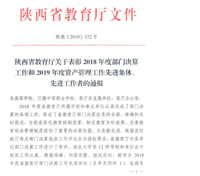 12月23日,陜西省教育廳下發(fā)《關(guān)于表彰2018年度部門決算工作和2019年度資產(chǎn)管理工作先進(jìn)集體、先進(jìn)工作者的通報》(陜教[2019]372號)文件,我校榮獲2019年度教育行政事業(yè)單位國有資產(chǎn)管理先進(jìn)集體。這是我校連續(xù)6年獲此榮譽。