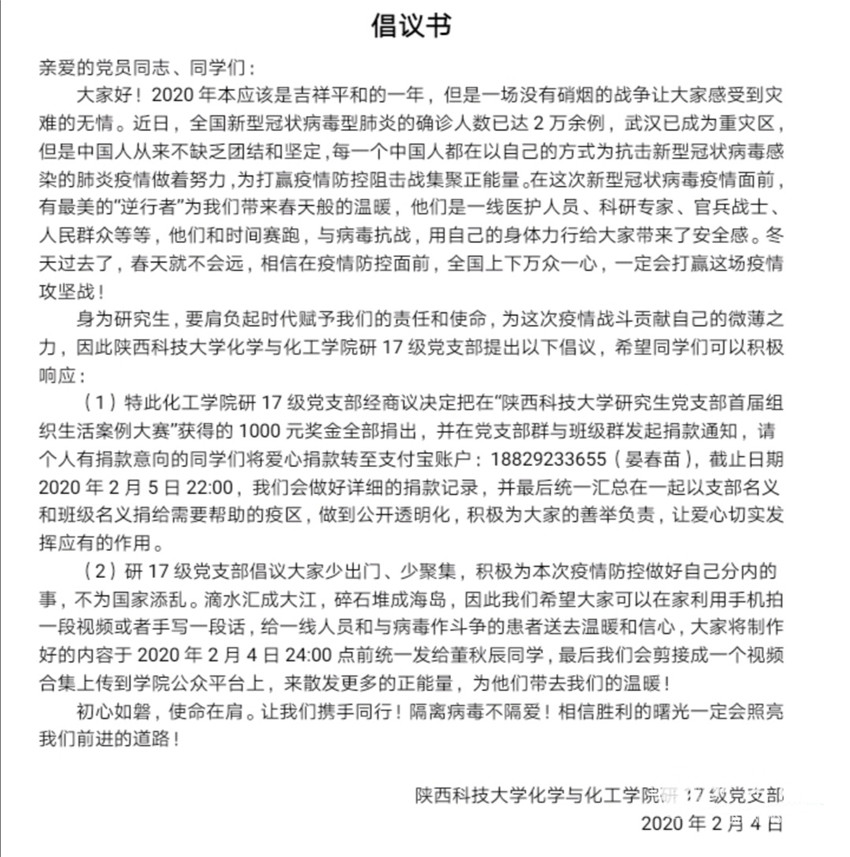 大愛無疆,共抗疫情!經商量,陜西科技大學設計與藝術學院研17黨支部決定把組織案例比賽所獲經費全部捐出,用于對抗此次疫情。我們希望可以為本次抗擊疫情貢獻綿薄之力,沒有一個冬天不會逾越,沒有一個春天不會來臨,我們相信一切都會好起來的,武漢加油,中國加油!愿我們早日摘掉口罩,共賞祖國春暖花開,壯麗河山!