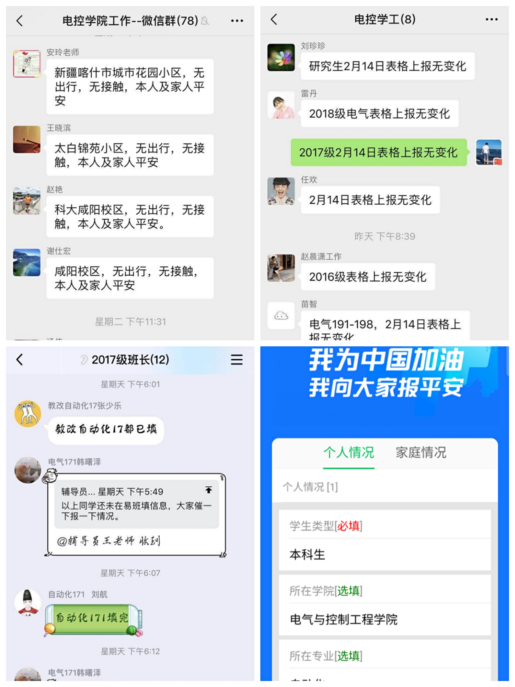 學(xué)院黨委積極防控部署,全面了解掌握全院師生寒假期間的外出情況、現(xiàn)居住地、本人及家屬的身體狀況。建立疫情信息臺賬,全院教工均能做到每日在規(guī)定時間內(nèi)通過學(xué)院微信、QQ群等途徑報(bào)告本人及同住親屬狀況,學(xué)院疫情防控工作聯(lián)絡(luò)員每天按時通報(bào)疫情防控和外地返校教職工動態(tài)。全體學(xué)生在學(xué)校易班信息上報(bào)開通前即開始每日報(bào)送個人信息動態(tài),后期進(jìn)一步通過易班加強(qiáng)學(xué)生信息核對,各年級輔導(dǎo)員及學(xué)生干部逐層把關(guān),實(shí)行實(shí)時數(shù)據(jù)更新匯報(bào),實(shí)現(xiàn)線上線下多渠道聯(lián)防,按時做好疫情報(bào)告工作。