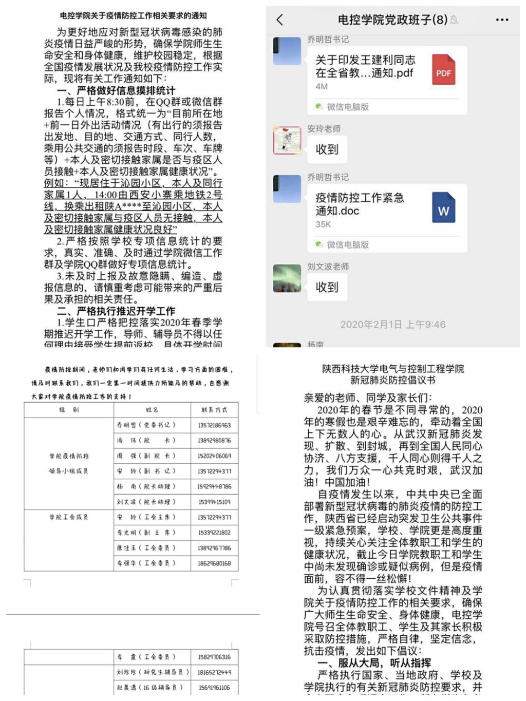 學(xué)院黨委積極響應(yīng)學(xué)校疫情防控工作領(lǐng)導(dǎo)小組的安排部署,第一時間成立由院黨委書記、院長任組長的疫情防控工作領(lǐng)導(dǎo)小組,細(xì)化擬定、及時發(fā)布《電控學(xué)院關(guān)于疫情防控工作相關(guān)要求的通知》《陜西科技大學(xué)電氣與控制工程學(xué)院新冠肺炎防控倡議書》,學(xué)院領(lǐng)導(dǎo)班子成員、工會成員、各黨支部書記、各年級輔導(dǎo)員、班團(tuán)學(xué)生干部根據(jù)文件要求及號召倡議,立足崗位、各司其職,確保防控全覆蓋,不留工作盲區(qū)。