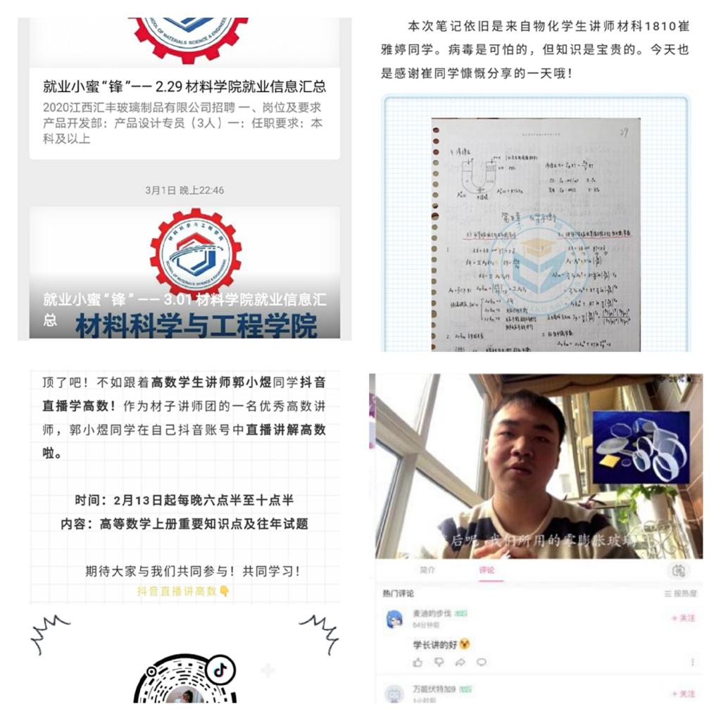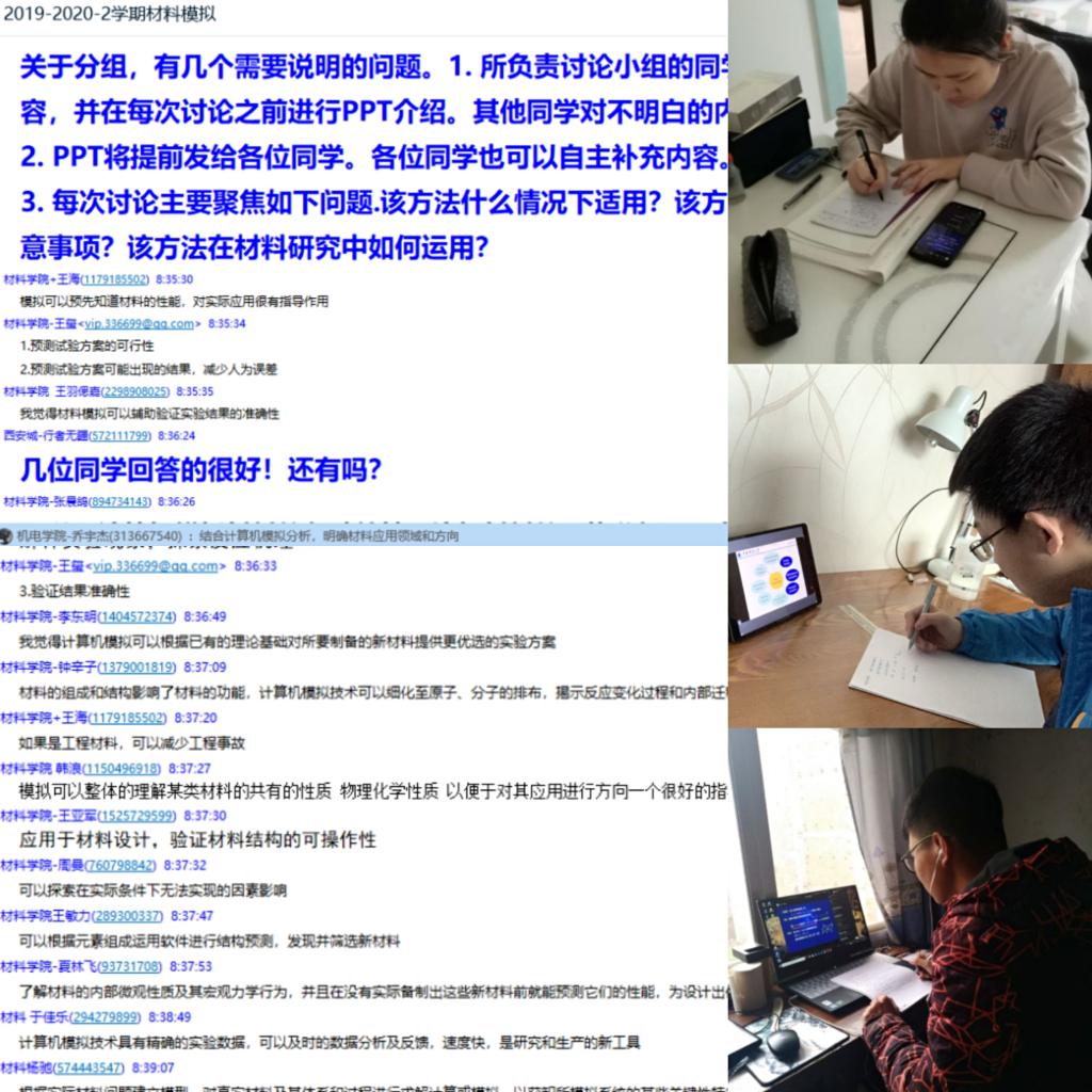 為了如期開課,提高線上授課質(zhì)量,材料學(xué)院有效開展線上教學(xué)主陣地建設(shè),充分準(zhǔn)備、提前調(diào)試,積極完成課程線上教學(xué)預(yù)案,組織教師線上培訓(xùn)70余人次。開課第一天,學(xué)院通過超星學(xué)習(xí)通、在線雨課堂、中國大學(xué)MOOC等平臺開課22門,涉及上課教師41人、上課學(xué)生近1000人次,到課率達(dá)99.8%,在線課堂簽到、講解、互動、討論、答疑等環(huán)節(jié)有序運(yùn)行。另外,學(xué)院還針對畢業(yè)生就業(yè)、畢業(yè)論文撰寫、補(bǔ)考等具體工作,安排教師開展線上“一對一”指導(dǎo);成立“黨員就業(yè)小分隊(duì)”,近22日來連續(xù)搜集整理線上招聘、復(fù)試調(diào)劑、公考等資訊向廣大畢業(yè)生發(fā)布;“材子講師團(tuán)”依托抖音、直播、筆記分享等方式開展線上學(xué)習(xí)和補(bǔ)考幫扶31人次。線上線下有序銜接,確保復(fù)學(xué)復(fù)教各項(xiàng)工作主動出擊,有所作為。