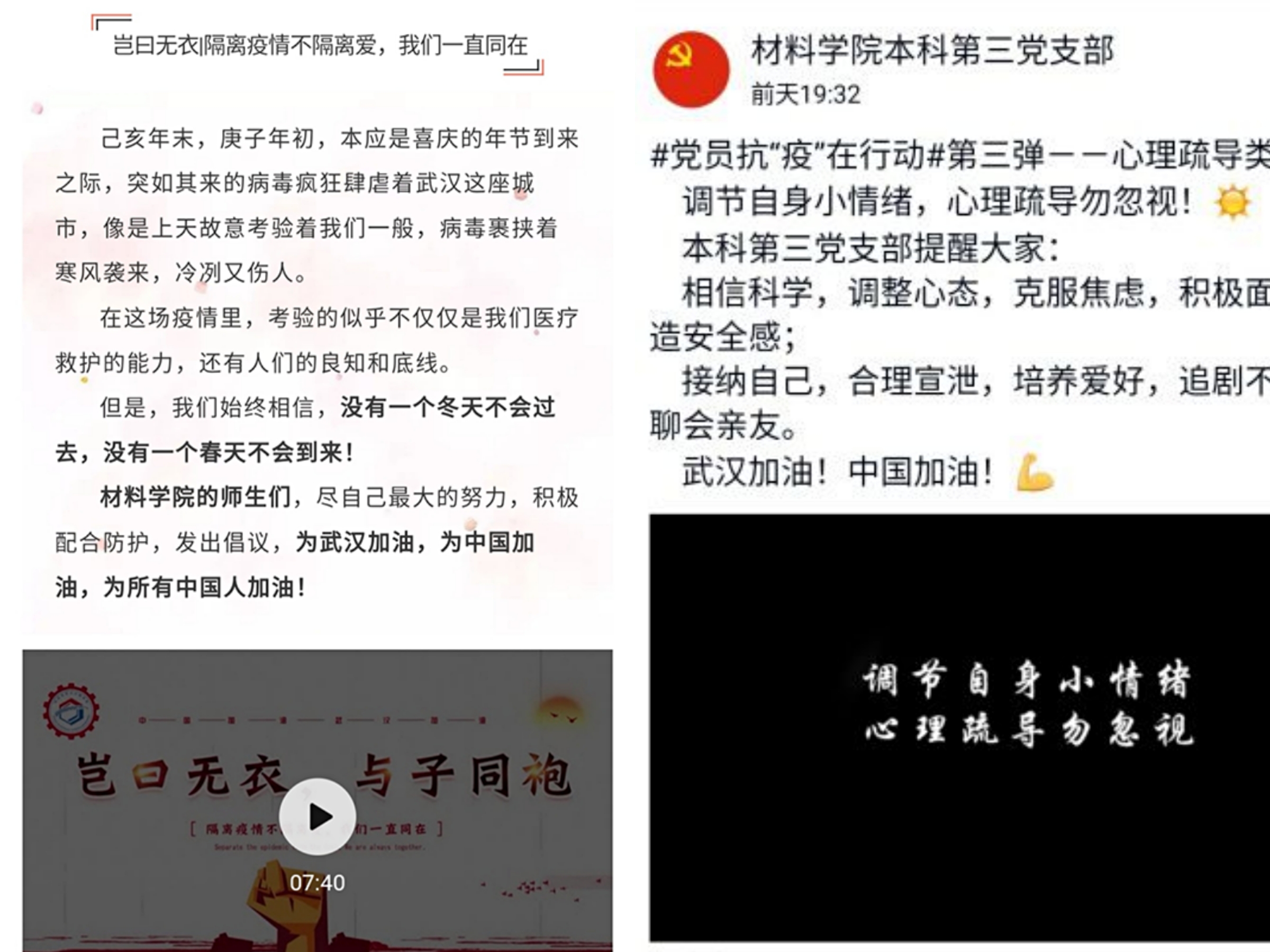 疫情發(fā)生以來,材料學(xué)院廣泛號召全體師生參與其中,冷靜客觀認(rèn)識疫情。截止目前,學(xué)院根據(jù)疫情發(fā)展發(fā)布《材料科學(xué)與工程學(xué)院關(guān)于做好新型冠狀病毒感染的肺炎疫情防控工作方案》3次,發(fā)布疫情工作通報(bào)3次,發(fā)布師生及校友倡議2次,各黨支部、學(xué)生組織通過視頻、推文等發(fā)布科普知識、心理疏導(dǎo)、家庭教育、日常防護(hù)等內(nèi)容,研究生導(dǎo)師開展線上 “一對一”心理疏導(dǎo)工作,全方位全員開展健康教育引導(dǎo)。另外,學(xué)院還有6位老師參與門衛(wèi)值守、快遞分發(fā)、蔬菜運(yùn)送等志愿服務(wù)工作、15位老師參與居家隔離 “一對一”聯(lián)絡(luò)幫扶工作、6名同學(xué)參加所在社區(qū)(村)疫情防控工作,用實(shí)際行動激發(fā)全員抗疫的信心。