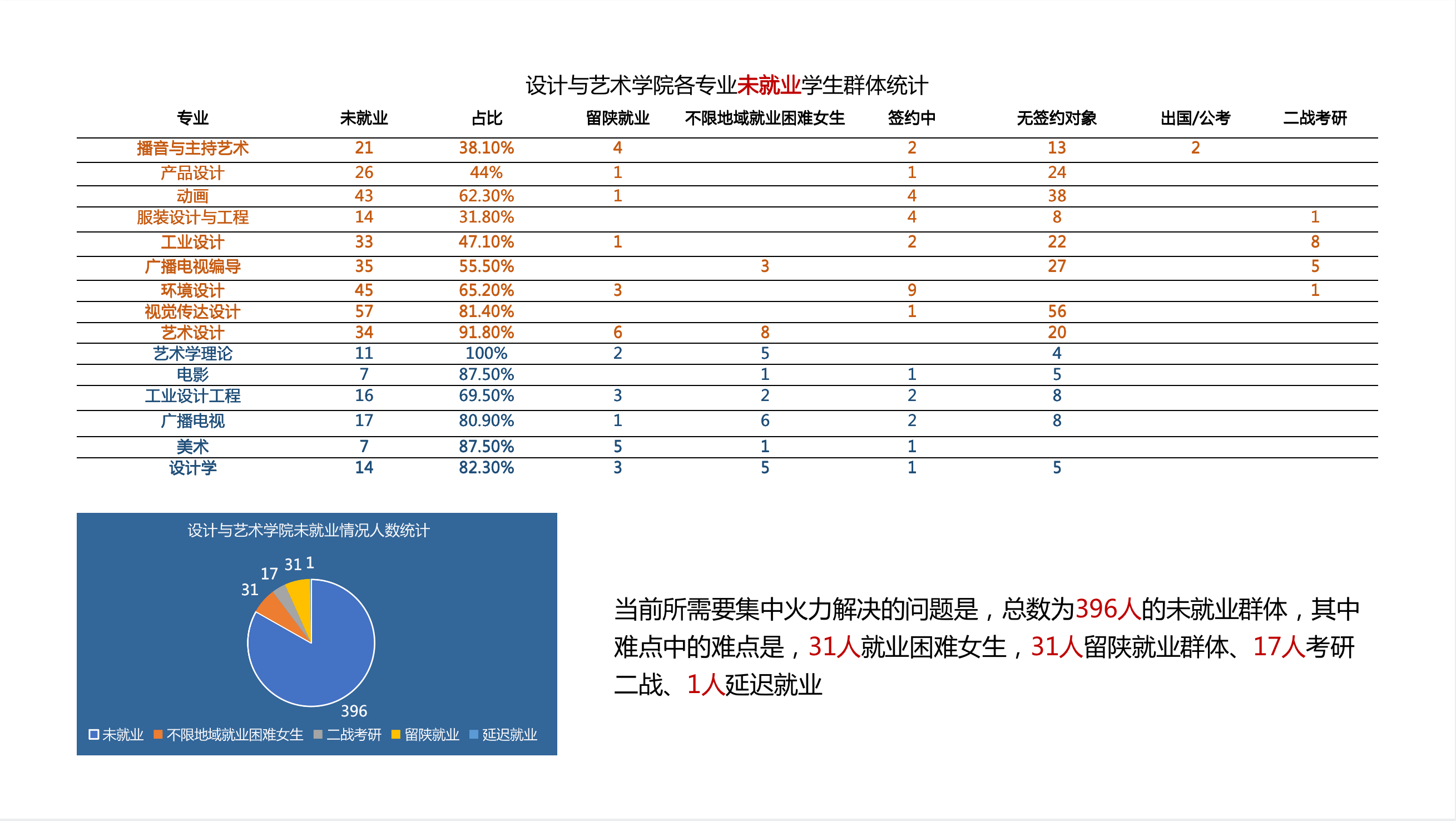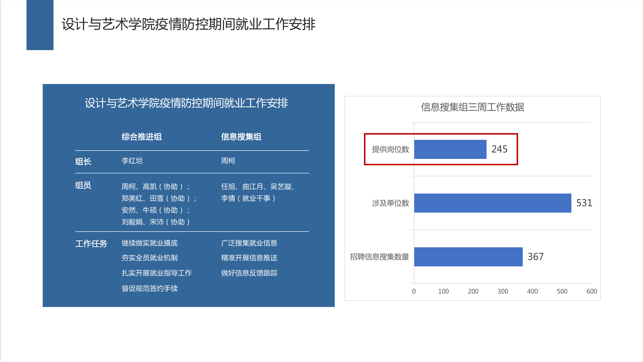 分門分類準確摸底,因人因需實施指導。根據(jù)《設(shè)計與藝術(shù)學院疫情防控期間的就業(yè)工作安排》,疫情防控期間,學院要求學生系統(tǒng)全體人員參與就業(yè)工作推進,并制定了全面摸底、梳理難題、各個擊破的實施思路。根據(jù)畢業(yè)班輔導員的調(diào)研反饋,本科的視覺傳達設(shè)計、服裝與服飾設(shè)計、服裝設(shè)計與工程專業(yè)、研究生的藝術(shù)學理論、藝術(shù)設(shè)計、設(shè)計學、廣播電視專業(yè)用人單位招聘崗位數(shù)量明顯下降,部分專業(yè)下降率甚至達到30%。針對該趨勢,學院將全體輔導員分為信息搜集組和綜合工作組兩個工作小組開展工作。工作開展三周以來,工作組共搜集招聘信息367條,涉及單位數(shù)531家,提供崗位數(shù)245個,開展專場招聘會3場,聯(lián)絡(luò)校友企業(yè)開展招聘會1場;同時,針對2020屆畢業(yè)近400人的未就業(yè)群體進行了詳細、周密的分類摸底,并建立工作臺帳,根據(jù)其不同需求進行崗位分揀,精準推送;針對26名“三類學生”、17名“考研二戰(zhàn)”、31名“留陜就業(yè)需求”、31名“就業(yè)困難女生”等學生群體為其建立“一對一”幫扶臺賬,并逐一聯(lián)系畢業(yè)設(shè)計指導教師或碩士生導師,共同為其制定就業(yè)幫扶策略。