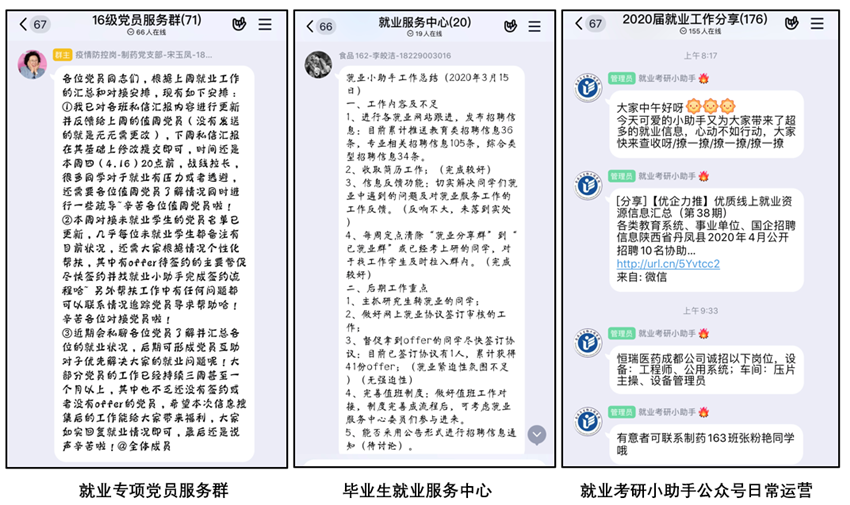 黨員主動擔當,學生朋輩骨干助力。全體畢業(yè)生黨員主動擔當,作為工作骨干參與并組建了學院畢業(yè)生就業(yè)服務中心—年級就業(yè)干事—就業(yè)專項黨員—班團兩委的四級就業(yè)團隊,積極在就業(yè)服務工作中發(fā)揮先鋒模范作用和朋輩效應。團隊為每專業(yè)配備1名就業(yè)干事協(xié)助就業(yè)工作,為每班級配備2名黨員輪流值周推送就業(yè)信息,為每名未就業(yè)學生指定畢業(yè)生黨員一對一結對精準就業(yè)幫扶,同時,學院就業(yè)服務中心運營公眾號“就業(yè)考研小助手”,常態(tài)發(fā)布就業(yè)信息、協(xié)助就業(yè)簽約,實時更新,每周匯報,年級內形成了人人知就業(yè),人人推就業(yè)的良好局面。