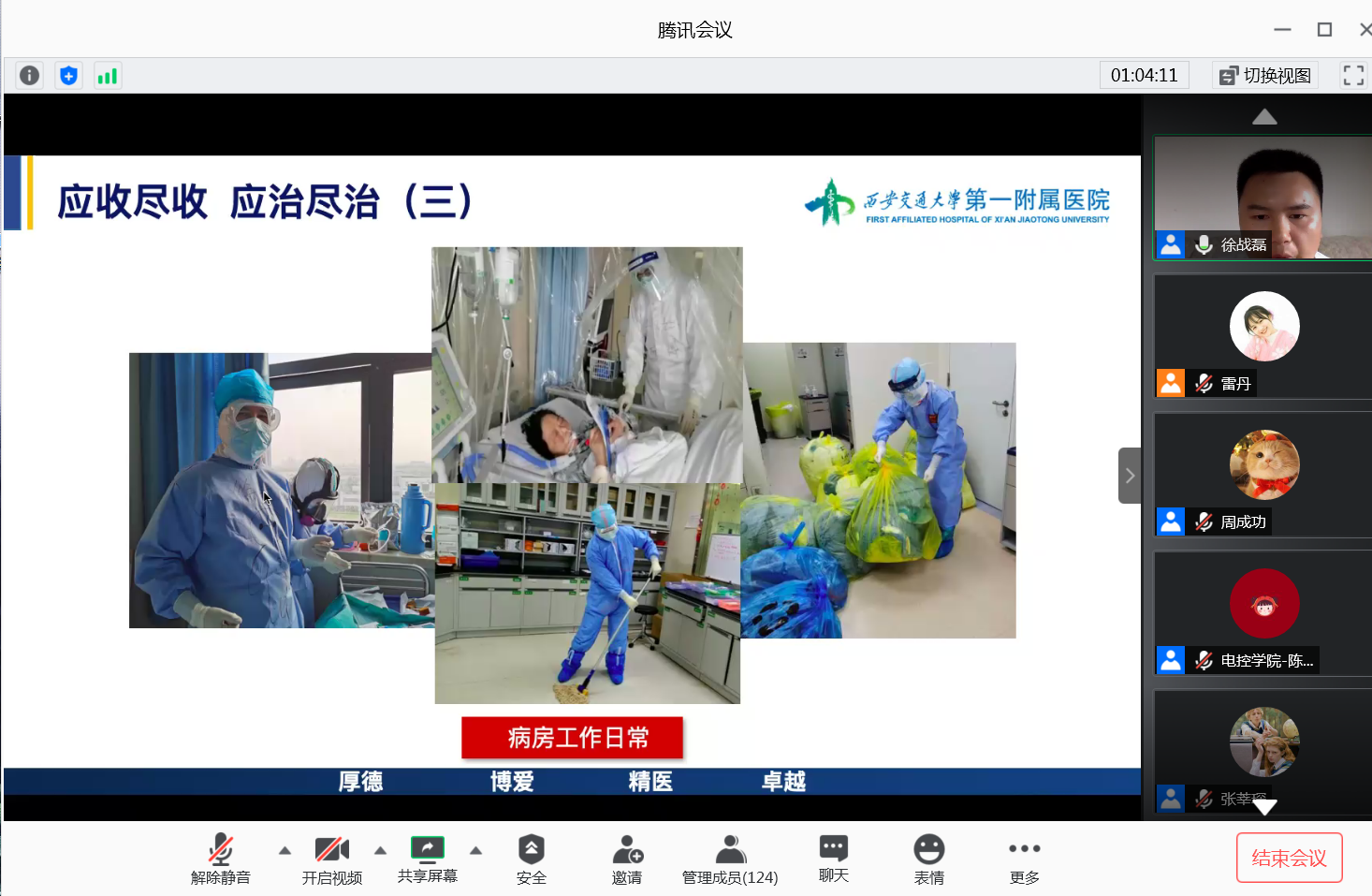 在援武漢期間,徐戰(zhàn)磊總結(jié)了這支醫(yī)療隊(duì)伍的四大亮點(diǎn),即在貫穿在救治過程中的統(tǒng)一思想,全隊(duì)采取半軍事化模式的分組管理、制定嚴(yán)格制度“八大”鐵律,堅(jiān)決守衛(wèi)安全底線,以隊(duì)員為中心,營造溫馨文化,增強(qiáng)團(tuán)隊(duì)凝聚力。這支強(qiáng)大的醫(yī)療隊(duì)伍飛躍七百多公里,只為救助受疫情肆虐的武漢市。六十五天的漫長奮戰(zhàn)每一天雖然是煎熬,但是都比不上每一位治愈出院、癥狀轉(zhuǎn)輕的患者所帶來的感動(dòng)與開心。在一動(dòng)一靜間,他們體會(huì)著時(shí)間的流淌,在一呼一吸間,感悟生命的價(jià)值,徐戰(zhàn)磊引人入勝的授課向我們展現(xiàn)何為當(dāng)下中共黨員的擔(dān)當(dāng),何為“我是黨員我先上”的精神姿態(tài)。