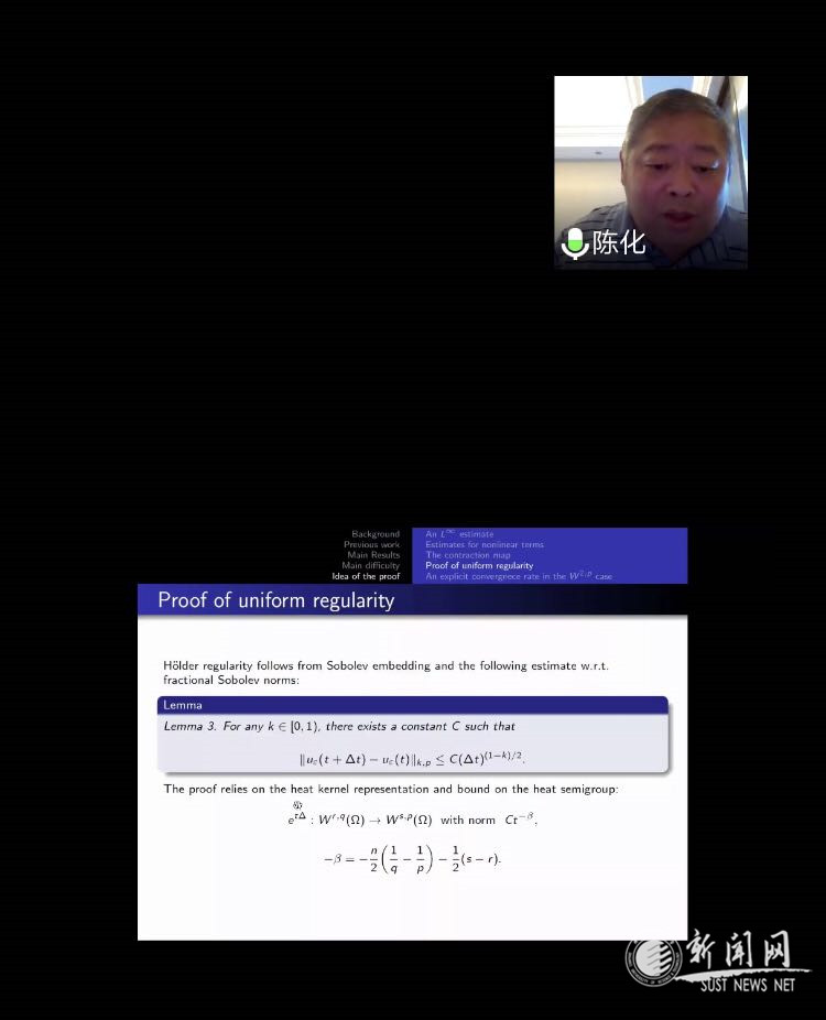 6月23日,應(yīng)文理學(xué)院邀請(qǐng),武漢大學(xué)陳化教授作客我校線上“前沿科學(xué)報(bào)告”,做了題為“關(guān)于一個(gè)趨化模型的消失粘性極限(Onthevanishing viscosity limit of a chemotaxis model)”的學(xué)術(shù)報(bào)告。報(bào)告會(huì)由文理學(xué)院數(shù)學(xué)學(xué)科學(xué)術(shù)帶頭人藺小林教授主持,數(shù)學(xué)系專業(yè)教師、研究生和部分本科生參加了此次報(bào)告會(huì)。報(bào)告會(huì)采用騰訊會(huì)議,線下和線上同步進(jìn)行。