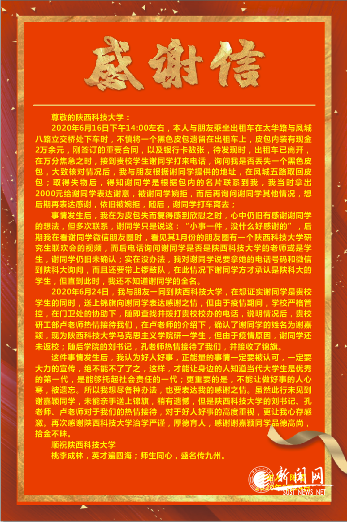 6月16日下午,陳先生不慎將隨身攜帶的黑色皮包遺落在出租車上,包內有現(xiàn)金2萬余元,剛簽訂的重要商業(yè)合同,以及數(shù)張銀行卡。萬分焦急之際,謝嘉穎同學聯(lián)系上他,在核實情況后將物品悉數(shù)歸還,并多次婉拒酬謝。后來,陳先生幾經周折、多方了解,才知道她是我校學生。陳先生表示,謝嘉穎同學的善舉不僅讓他們避免了財產損失,更讓他們在疫情影響下的經營困難期感受到溫暖的力量,這種好人好事,應該讓學院、學校乃至社會上更多的人們知曉,將正能量更好地傳播出去。由于謝嘉穎同學沒有在校,希望學院老師轉達謝意。
