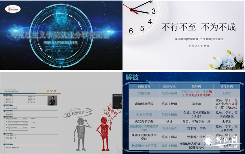 分享會上,王思嘉結合自身從鄉(xiāng)鎮(zhèn)村官到縣直機關,再到市委組織部,后又考入省人防辦,幾年來公務員考試的親身經(jīng)歷,從“是什么?為什么?怎么考?”三個方面進行了公務員考試的經(jīng)驗分享,提醒同學們備考公務員,首先要正確理解公務員的職業(yè)屬性,其次要合理設定職業(yè)目標,第三要掌握科學高效的備考方法。即將入職咸陽師范學院思政課教師的石艷嬌同學,首先用“我想做什么?”和“我能做什么?”引發(fā)同學們思考,緊接著從就業(yè)前提、就業(yè)要求和就業(yè)準備三方面,最后提醒同學們要善于學習,敢于嘗試,不斷提升自己,積極主動提前做好求職各項準備。簽約楊凌職業(yè)技術學院思政課教師的霍登煌同學,分別“從目標定位:知己解彼此”“優(yōu)化簡歷:推銷自我”“暢通信息:沉著報考”三個方面,結合求職經(jīng)歷,帶領大家一起分析了就業(yè)方向和面試基本要求、簡歷制作技巧、備考注意事項等,并針對會前收集到的同學普遍關注的求職和學業(yè)問題,一一解答。