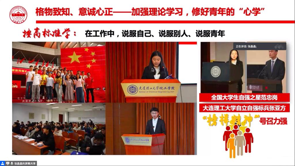 張晶晶結(jié)合共青團(tuán)工作改革的思路與做法以及青年人如何開展理論學(xué)習(xí)兩項(xiàng)重點(diǎn)內(nèi)容,聯(lián)系大連理工大學(xué)的實(shí)際情況,向參會(huì)學(xué)員分享了“青馬工程”,“實(shí)驗(yàn)室開放日”等品牌團(tuán)學(xué)活動(dòng)的開展情況與育人效果,用實(shí)際案例對(duì)青年團(tuán)員寄予了“格物致知、意誠(chéng)心正”、“日新而進(jìn)、精進(jìn)永固”的殷切期望。學(xué)員們認(rèn)真聽講、積極互動(dòng),對(duì)授課內(nèi)容產(chǎn)生了強(qiáng)烈共鳴。