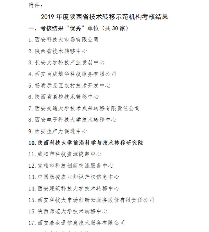 陜西省科學技術廳關于公布2019年度陜西省技術轉移示范機構考核結果的通知:http://kjt.shaanxi.gov.cn/kjzx/tzgg/189053.html