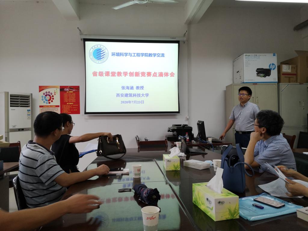 7月23日,為進一步加強本科課堂創(chuàng)新和改革,將課堂思政和新工科理念融入日常教學活動,推動學院本科教學質(zhì)量持續(xù)提升,環(huán)境學院邀請首屆“陜西省課堂教學創(chuàng)新大賽”一等獎獲得者、西安建筑科技大學環(huán)境與市政工程學院張海涵教授等專家來校指導大賽準備情況,分享參賽經(jīng)驗。環(huán)境學院副院長郭軍康主持會議,學院教學指導委員會成員和參賽青年教師代表侯銀萍、張莎、賈紅磊、王先寶等參加會議。