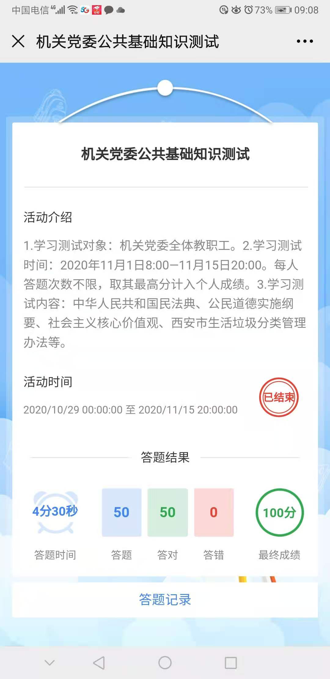 本次學(xué)習(xí)測試運(yùn)用“iS科大”平臺,采用在線方式進(jìn)行,答題不限時間和次數(shù),目的在于學(xué)懂弄會。試卷共50題,全部為單選題。內(nèi)容涵蓋《中華人民共和國民法典》、《公民道德實(shí)施綱要》、《社會主義核心價值觀》、《西安市生活垃圾分類管理辦法》等。