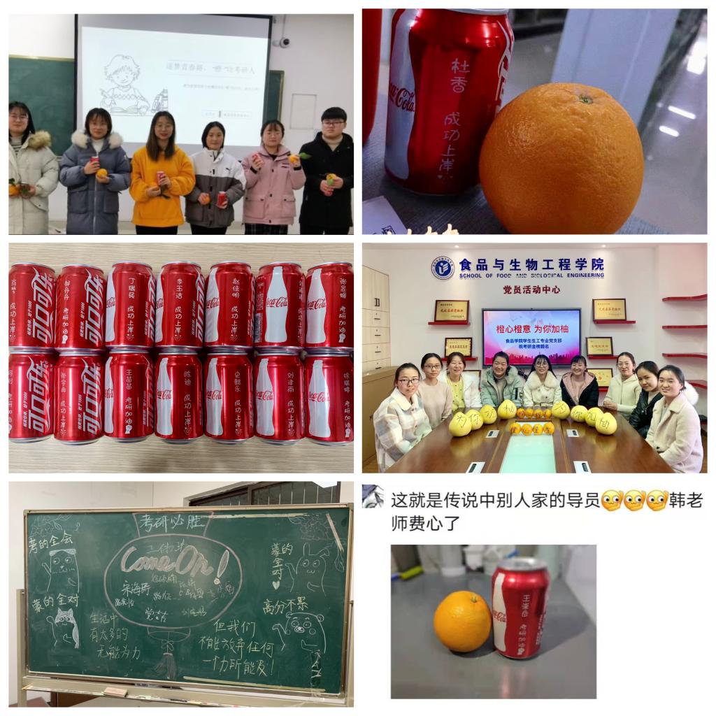2021年考研初試進(jìn)入倒計(jì)時(shí),12月9日下午,教學(xué)樓F座的兩個(gè)教室里充滿了驚喜聲,食品與生物工程學(xué)院開展的“逐夢(mèng)青春路,‘橙’功考研人”學(xué)生黨支部主題黨日活動(dòng),為考研學(xué)生送上近200份“加油大禮包”。禮包中,一份臍橙寓意“臍”開得勝、馬到“橙”功,一瓶定制可樂印上了每個(gè)考研學(xué)生的姓名和“考研加油、成功上岸”等加油語。收到專屬“加油包”的考研學(xué)子興奮不已,紛紛表示,學(xué)院精心準(zhǔn)備的專屬禮品充滿了對(duì)大家的殷切期待和美好祝福,增強(qiáng)了同學(xué)們的斗志和信心,在考試的最后緊張沖刺階段,大家一定會(huì)持之以恒、一鼓作氣,成功“上岸”。