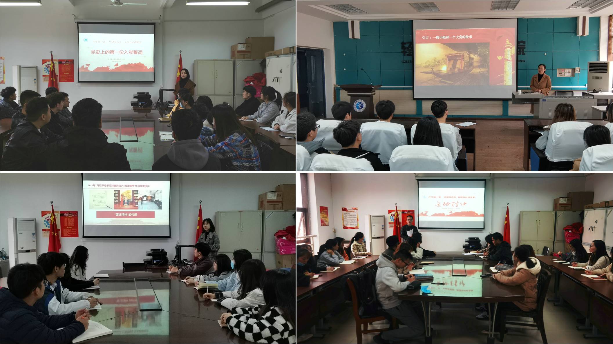 研究生第一黨支部書記郝建武以“長(zhǎng)征精神”為切入點(diǎn),從長(zhǎng)征的背景過程、典型故事等為支部黨員講黨課,引導(dǎo)黨員明確青年時(shí)代擔(dān)當(dāng),發(fā)揮黨員先鋒作用。全體黨員一致表示,將沿著革命先輩開辟的精神路線,百折不撓,不懈奮斗,走好我們這一代人的“長(zhǎng)征路”;研究生第二黨支部書記李丹圍繞“西遷精神”的時(shí)代背景、深刻內(nèi)涵等帶領(lǐng)支部黨員深刻領(lǐng)會(huì)“西遷精神”的時(shí)代意義,啟發(fā)大家深入思考青年黨員應(yīng)如何傳承好“西遷精神”,用實(shí)際行動(dòng)擦亮標(biāo)簽,做好新時(shí)代“領(lǐng)跑員”;本科第一黨支部書記張維靜以“紅船精神”主題給支部黨員上了一堂生動(dòng)而又形象的黨課,她從“一艘小船和一個(gè)大黨”的故事講起,深刻解讀“紅船精神”內(nèi)涵,并結(jié)合身邊事例引導(dǎo)廣大黨員堅(jiān)定理想信念、敢于擔(dān)當(dāng)、勇于創(chuàng)新,在為黨和人民事業(yè)的奮斗中實(shí)現(xiàn)青春價(jià)值、創(chuàng)造人生輝煌;本科第二黨支部書記劉紅帶領(lǐng)支部黨員重溫了入黨誓詞,圍繞我黨第一份入黨誓詞的誕生,闡述入黨誓詞的含義和時(shí)代背景,啟發(fā)學(xué)生黨員要知史明史、以史為鑒,引導(dǎo)廣大黨員對(duì)照入黨誓詞檢視自身、對(duì)照問題找差距,號(hào)召廣大黨員在學(xué)習(xí)生活中積極發(fā)揮先鋒模范作用。