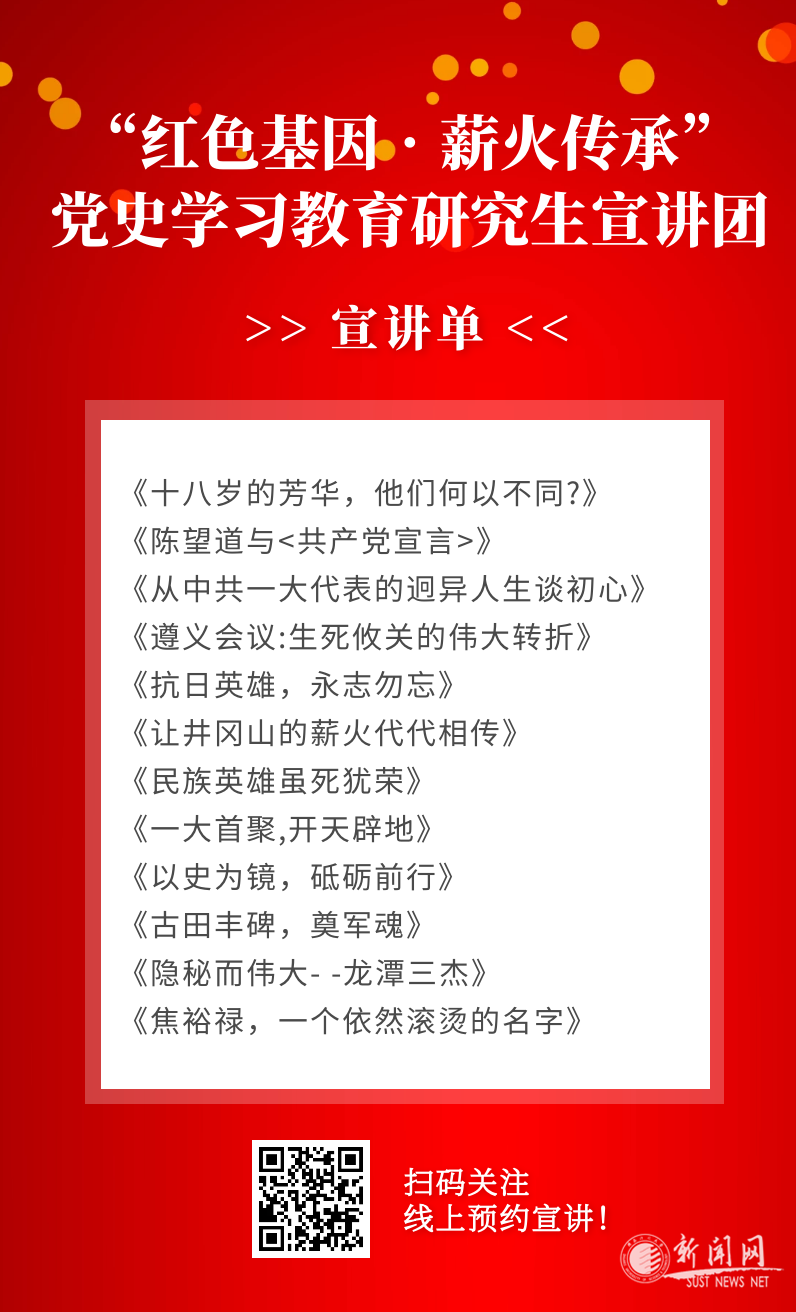 為深入學習宣傳貫徹習近平總書記在黨史學習教育動員大會上的重要講話精神,推動青年學生黨史學習教育走深走實,黨委研究生工作部和馬克思主義學院共同指導,成立了陜西科技大學“紅色基因?薪火傳承”黨史學習教育研究生宣講團。