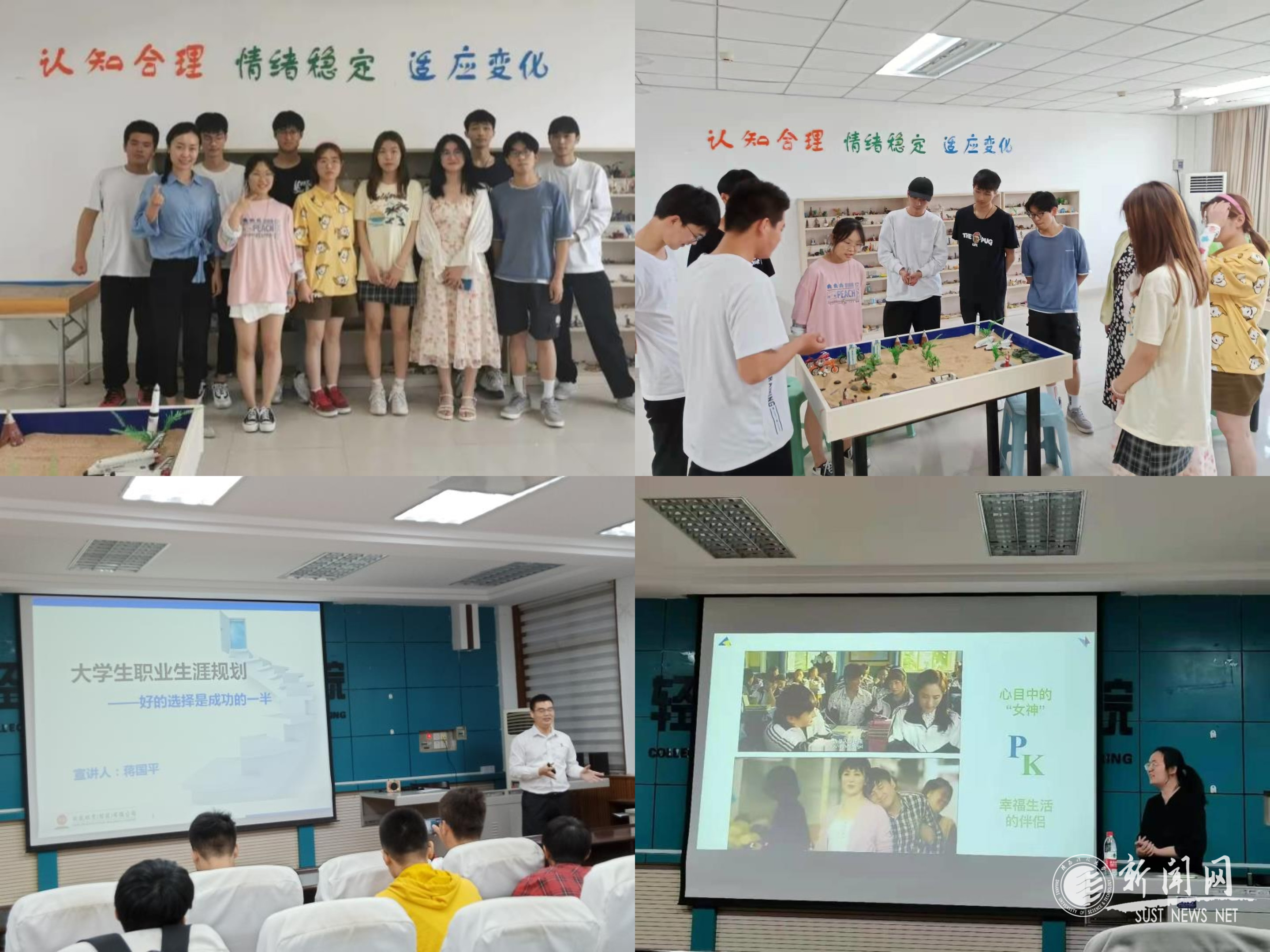 豐富實(shí)踐活動(dòng),營(yíng)造健康氛圍。學(xué)院以心理育人宣傳季活動(dòng)為契機(jī),聚力而行,開展多項(xiàng)沉浸式實(shí)踐體驗(yàn)活動(dòng)。在5月20日“自我覺察?與你相伴”人際關(guān)系沙盤團(tuán)體輔導(dǎo)中,引導(dǎo)學(xué)生發(fā)覺在人際交往中的自我意識(shí)和無意識(shí),幫助同學(xué)們進(jìn)行悅納自己、善待他人的調(diào)節(jié);在4月份心理情景劇特色活動(dòng)中,學(xué)生積極參與,營(yíng)造了團(tuán)結(jié)向上友善的互助氛圍;在5月份正在進(jìn)行的“規(guī)劃自我?創(chuàng)想未來”職業(yè)生涯規(guī)劃大賽中,結(jié)合生涯理論幫助學(xué)生解決階段心理困惑,引導(dǎo)學(xué)生正確擇業(yè)觀和遠(yuǎn)大職業(yè)抱負(fù),積極向上的求學(xué)氛圍愈發(fā)濃厚。
