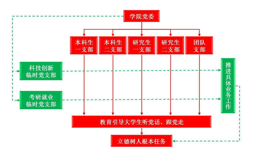 學院黨委積極構建縱橫結合的黨建矩陣,縱向以黨支部為抓手,進行黨建工作的垂直業(yè)務指導,教育引導大學生堅決聽黨話跟黨走;橫向借鑒事業(yè)部制管理模式,依托考研就業(yè)、科技創(chuàng)新等具體工作成立臨時黨支部,形成黨建工作與業(yè)務工作推進相結合的組織矩陣,以高質(zhì)量黨建引領高質(zhì)量發(fā)展。
