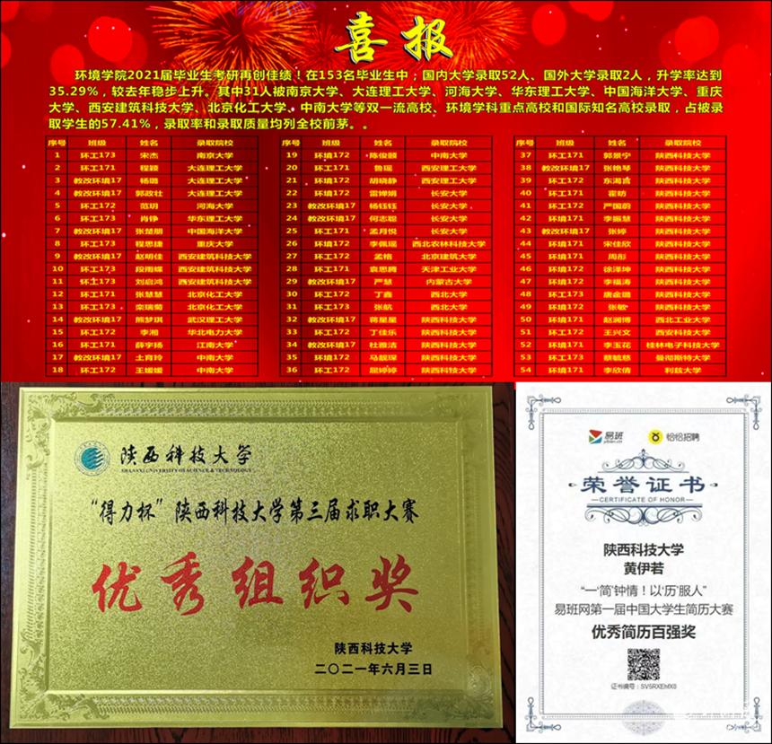 為破解“考研率、就業(yè)質(zhì)量與學院發(fā)展定位不相稱”難題,學院黨委成立“考研就業(yè)臨時黨支部”,找準工作“小切口”,在為人民服務最前沿“解難題”,開展“考研黨員一幫一”活動,通過經(jīng)驗介紹、課程輔導、目標院校選擇輔導等對考研學生進行“一幫一”指導,2021屆畢業(yè)生中考研報名率65.4%、考研上線率41.8%、考研錄取率35.3%,均創(chuàng)學院歷史新高,31名學生被南京大學、大連理工大學、中國海洋大學等“雙一流”高?;蚪逃繉W科評估環(huán)境科學與工程學科“B”以上高校錄??;開展“就業(yè)黨員一幫一”活動,通過生涯規(guī)劃指導、簡歷制作指導、面試技巧指導等對畢業(yè)生進行“一幫一”指導,在易班網(wǎng)第一屆中國大學生簡歷大賽中,黨員黃伊若榮獲 “優(yōu)秀簡歷百強獎”;在“得力杯”陜西科技大學第三屆求職大賽中,黨員孫于清榮獲三等獎、黨員黃伊若榮獲人氣獎、環(huán)境學院榮獲優(yōu)秀組織獎。30余名優(yōu)秀畢業(yè)生前往國家能源集團、中海集團、中國石化、中國葛洲壩集團、中國電建集團等知名企業(yè)就業(yè),畢業(yè)生就業(yè)質(zhì)量明顯提升。