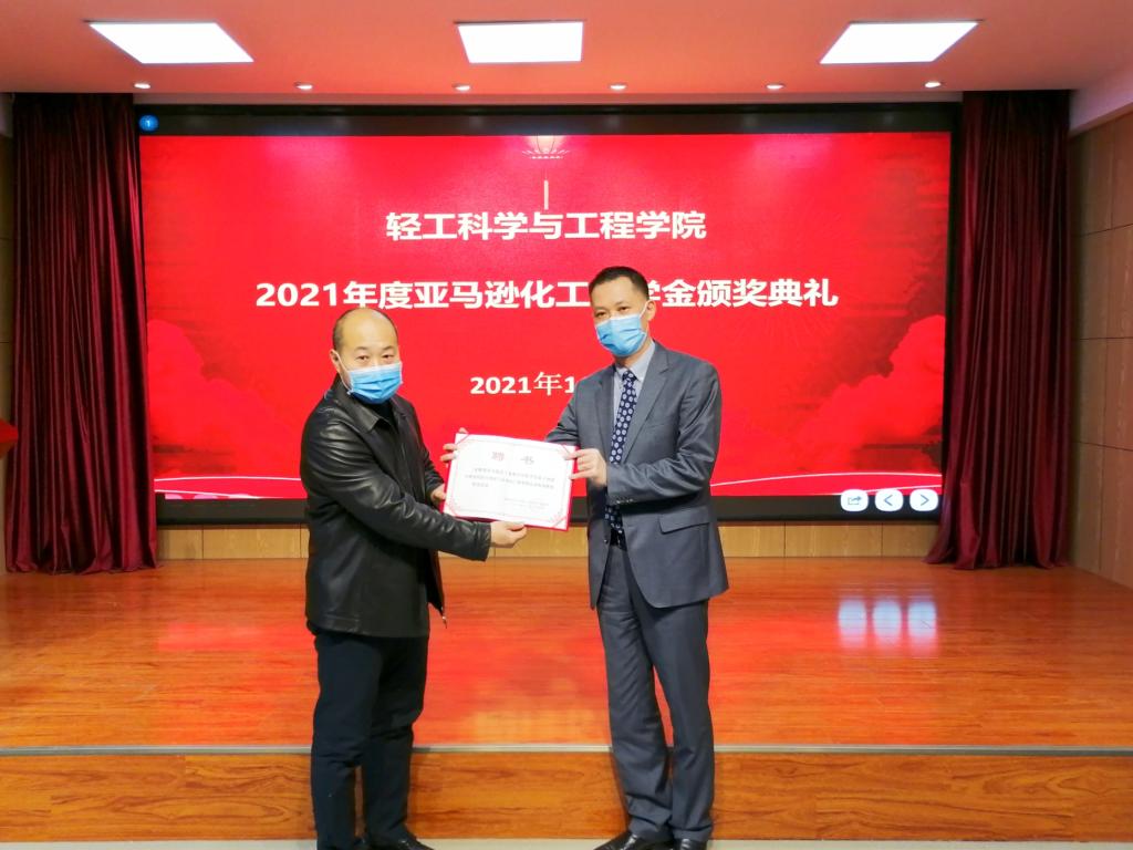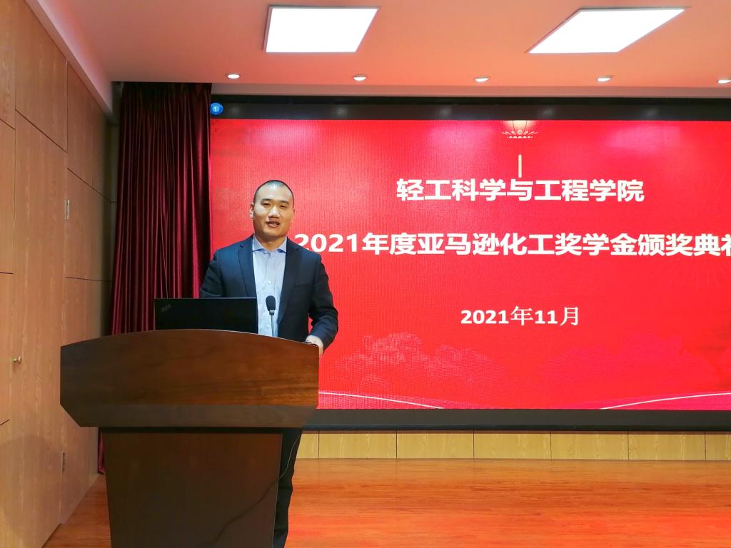 11月26日,“亞馬遜化工”企業(yè)獎(jiǎng)學(xué)金頒獎(jiǎng)典禮暨企業(yè)導(dǎo)師聘任儀式在輕工科學(xué)與工程學(xué)院一樓學(xué)術(shù)報(bào)告廳舉行。亞馬遜化工有限公司技術(shù)總監(jiān)盧焌鏢、區(qū)域經(jīng)理王興飛、客戶經(jīng)理張彬,輕工學(xué)院副院長(zhǎng)張輝、黨委副書記張乾隆、造紙工程系主任羅清、造紙工程系教授韓卿及學(xué)生代表參加儀式。